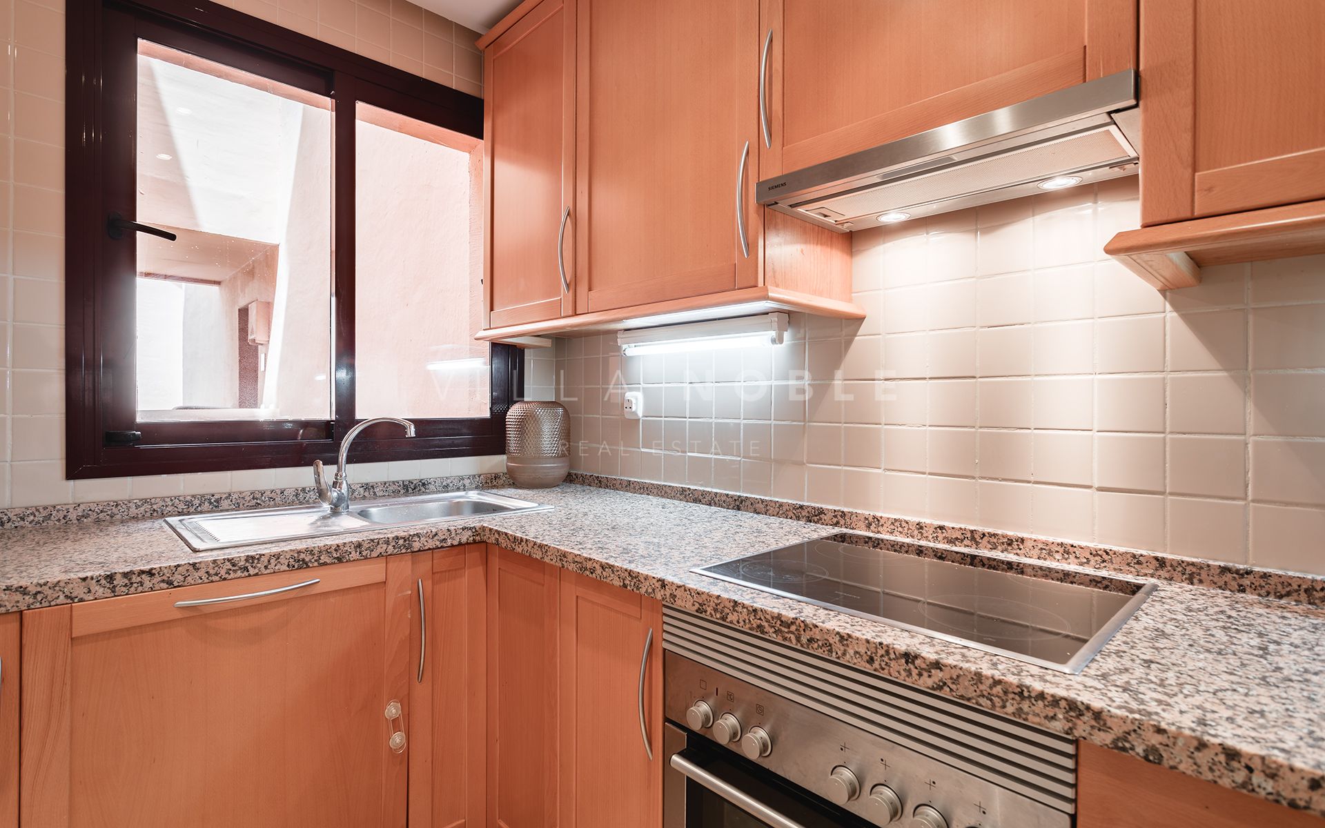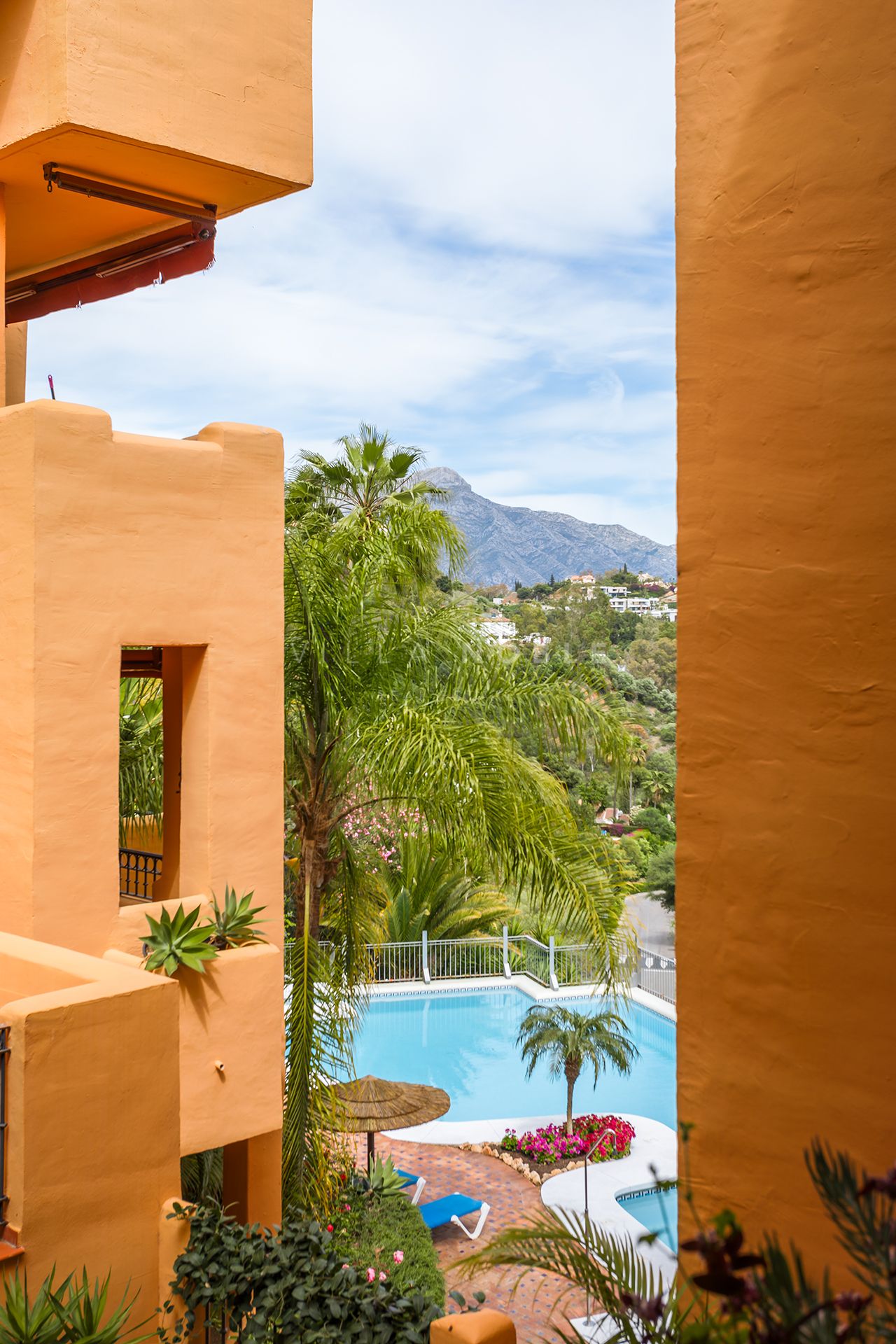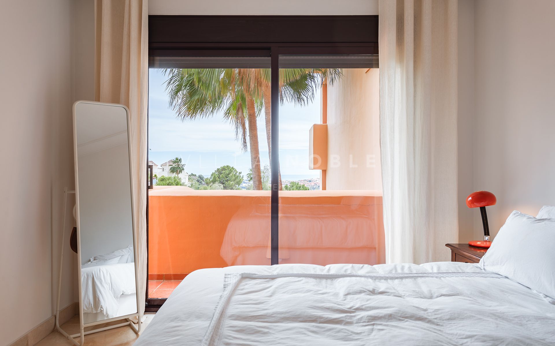 Unmittelbar unterhalb des Geschäftszentrums Monte Halcones in der ruhigen Wohnanlage Puerto del Almendro gelegen, bietet dieses geräumige Apartment im ersten Stock eine außergewöhnliche Kombination aus Privatsphäre, Panoramablick aufs Meer und gehobenem Komfort. Die Unterkunft befindet sich in einer sicheren, makellos gepflegten Wohnanlage und bietet absolute Ruhe. Strand und San Pedro sind nur 5 Fahrminuten entfernt, und lokale Geschäfte, Restaurants und Cafés sind bequem zu Fuß erreichbar.