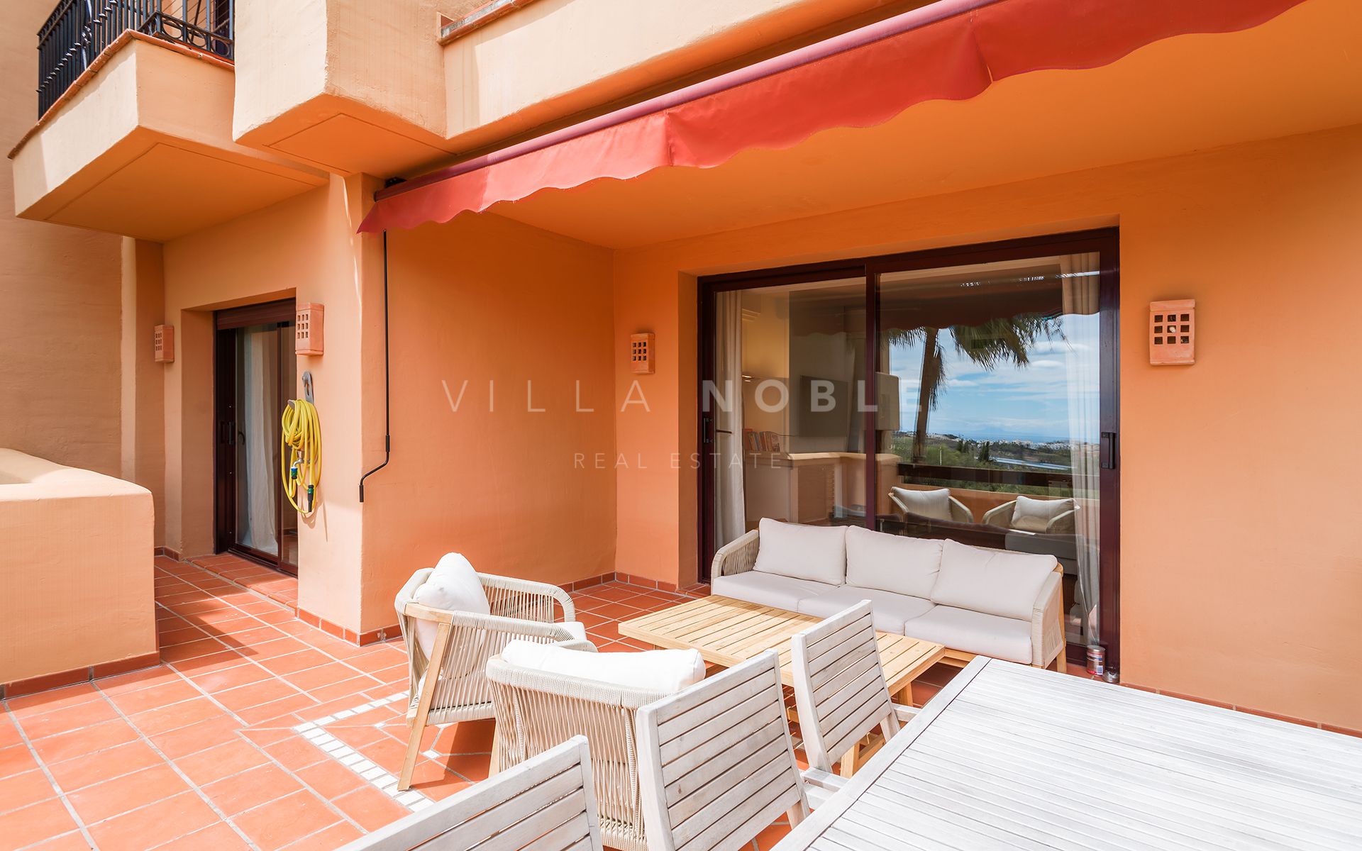 Das lichtdurchflutete Apartment verfügt über einen großzügigen Wohn- und Essbereich mit Kamin, der sich zu einer teilweise überdachten Terrasse mit Panoramablick über das Mittelmeer, Gibraltar und Afrika öffnet; eine voll ausgestattete, separate Küche mit viel Arbeitsfläche und geräumigen, übersichtlichen Schränken; zwei großzügige Doppelschlafzimmer mit jeweils eigenem Bad und Einbauschränken, wobei das Hauptschlafzimmer direkten Zugang zur Terrasse bietet; sowie ein Gäste-WC für Besucher.
