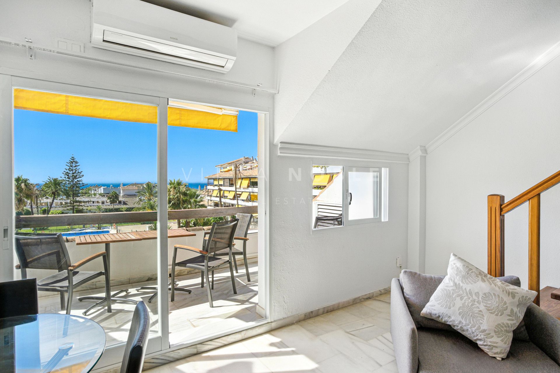 Es verfügt über ein helles und geräumiges Zimmer mit einem Eingangsbereich und einem abgeschlossenen Pflanzengarten mit vollständig ausgestatteter Küche, einem Gästeschlafzimmer mit Gästebad und einer privaten Terrasse mit Ausblick auf die Gemeinschaftspools, angelegten Gärten und bietet fantastische Ausblicke auf das Meer. Arriba, das Hauptschlafzimmer verfügt über ein Badezimmer mit Bad und viel natürliches Licht.