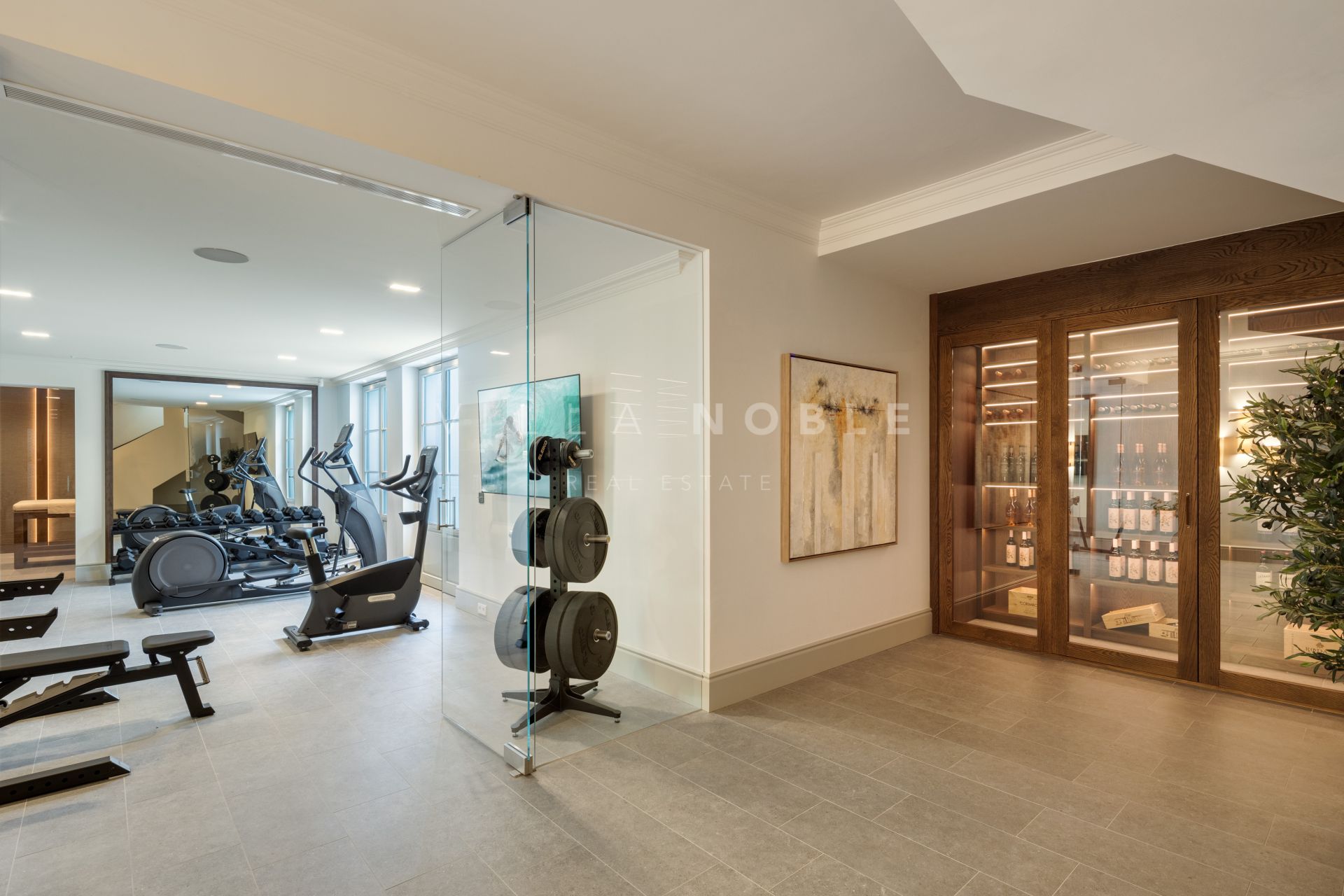 Im Untergeschoss ist die Villa auf Lifestyle und Entspannung ausgerichtet. Ein privater Kinoraum, ein Massagebereich, ein voll ausgestatteter Fitnessraum und ein Kinoraum bieten vielfältige Freizeitmöglichkeiten für Bewohner und Gäste. Ein temperaturgeregelter Weinkeller steht ebenfalls zur Verfügung. Auf dieser Etage befinden sich außerdem voll ausgestattete Serviceräume, zwei Schlafzimmer mit eigenem Bad und eine Küchenzeile, die die Funktionalität des Hauses unterstützen, ohne die Privatsphäre zu beeinträchtigen.