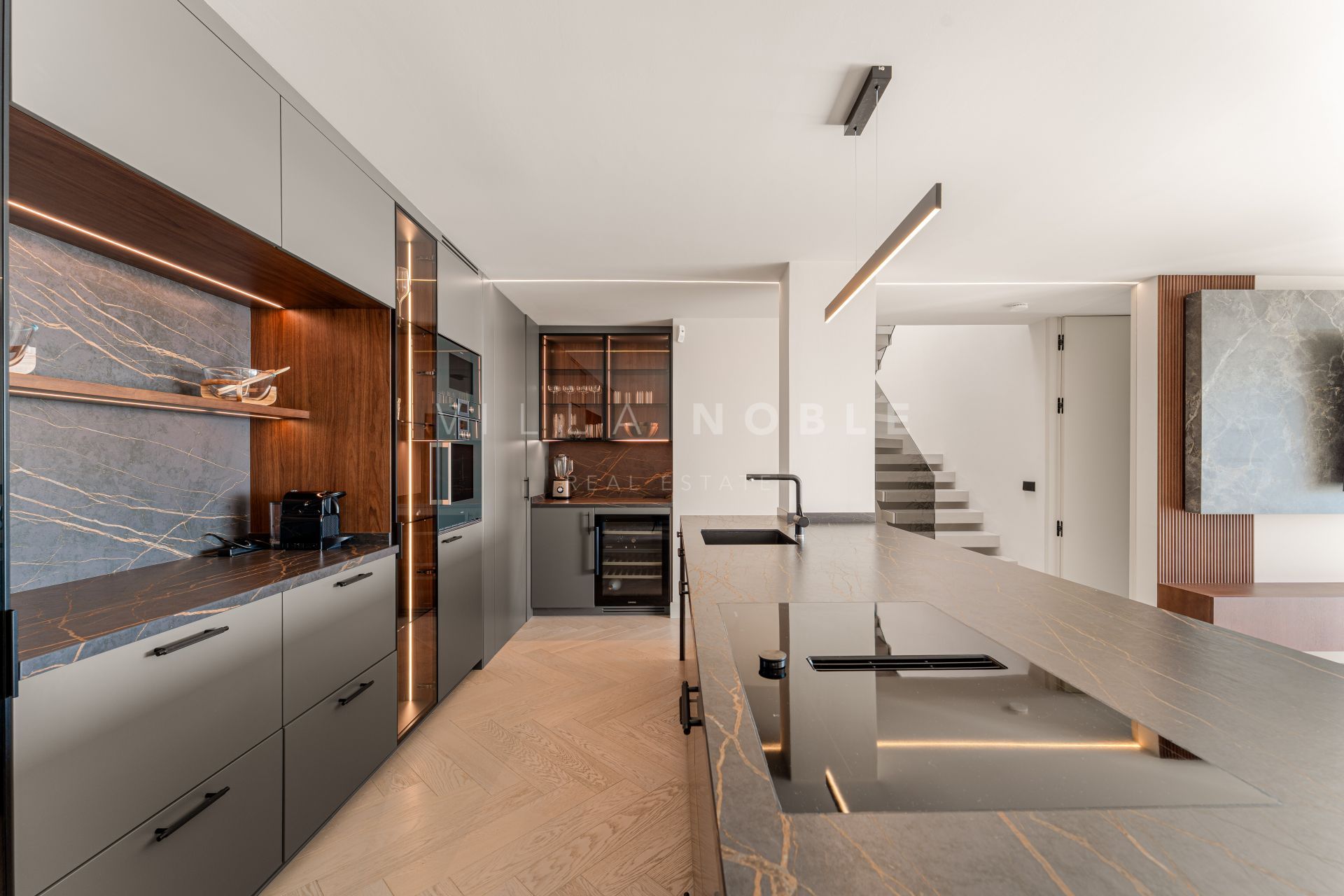 Die Wohnbereiche sind offen und miteinander verbunden. Der Wohn- und Essbereich geht nahtlos in eine hochmoderne Küche mit Gaggenau-Geräten über. Maßgefertigte Holzarbeiten sorgen für Wärme und Eleganz, während große Glastüren direkt auf die Terrassen führen, die für das Leben im Freien konzipiert sind. Diese Räume eignen sich perfekt für Unterhaltung, Mahlzeiten im Freien oder einfach zum Entspannen mit Blick auf die umliegende Landschaft. Ein eigener 20 m² großer Abstellraum bietet ausreichend Platz und sorgt für einen aufgeräumten und eleganten Innenraum.