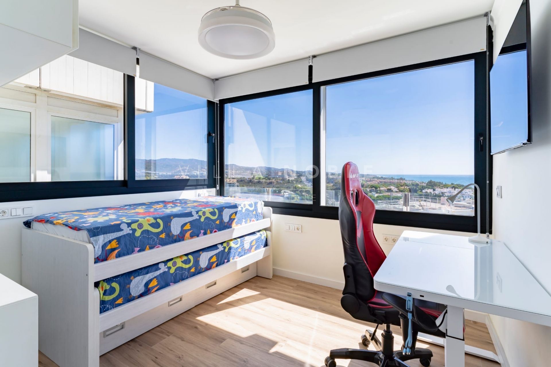 Die Wohnung bietet einen atemberaubenden Panoramablick auf das Mittelmeer, die Berge und den Golfplatz. Das kürzlich nach höchsten Standards renovierte, moderne Interieur besticht durch elegante Oberflächen, viel Tageslicht und große Fenster, die die atemberaubende Landschaft einrahmen.