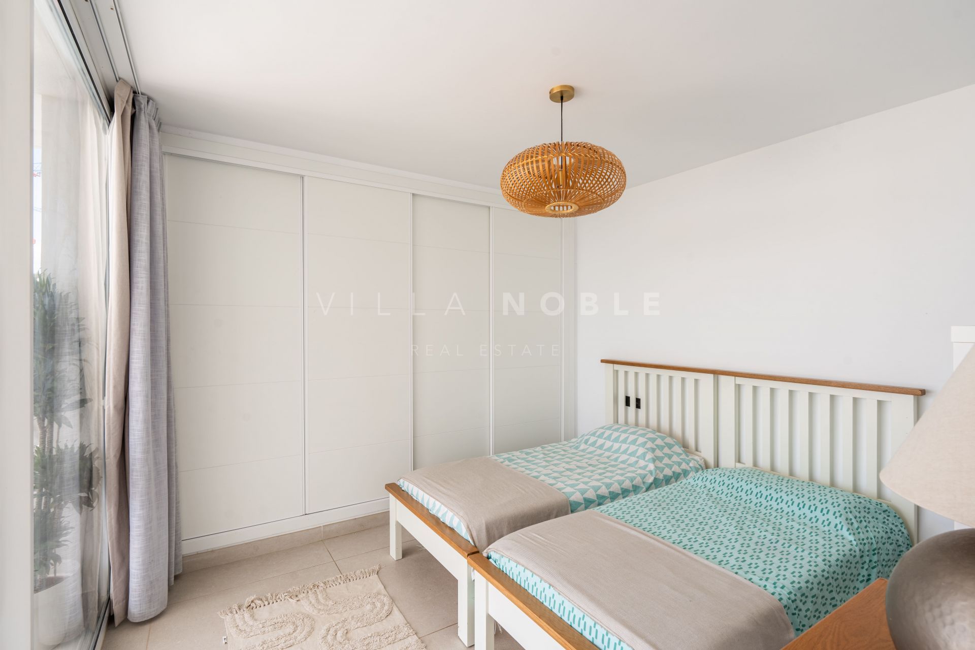 The interior features open-plan living areas with large sliding doors that connect seamlessly to the outdoor terrace, perfect for dining and relaxing. The kitchen is modern and fully equipped, catering to everyday needs with a clean, minimalist style.