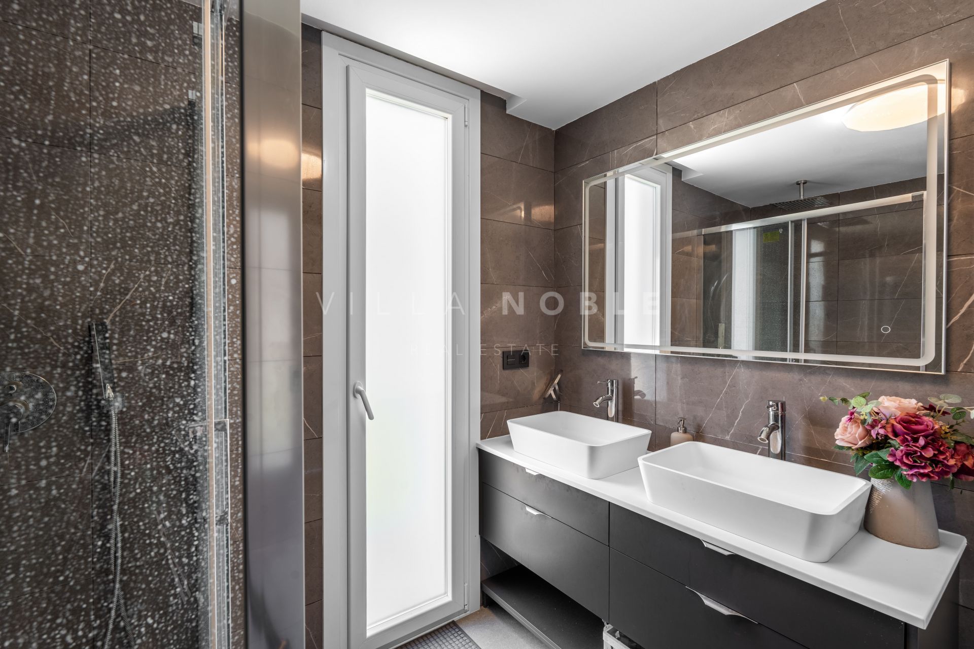 Outside, the private garden and pool area create a calm environment for relaxation or entertaining. The lush greenery and panoramic views bring a sense of connection to the natural landscape.