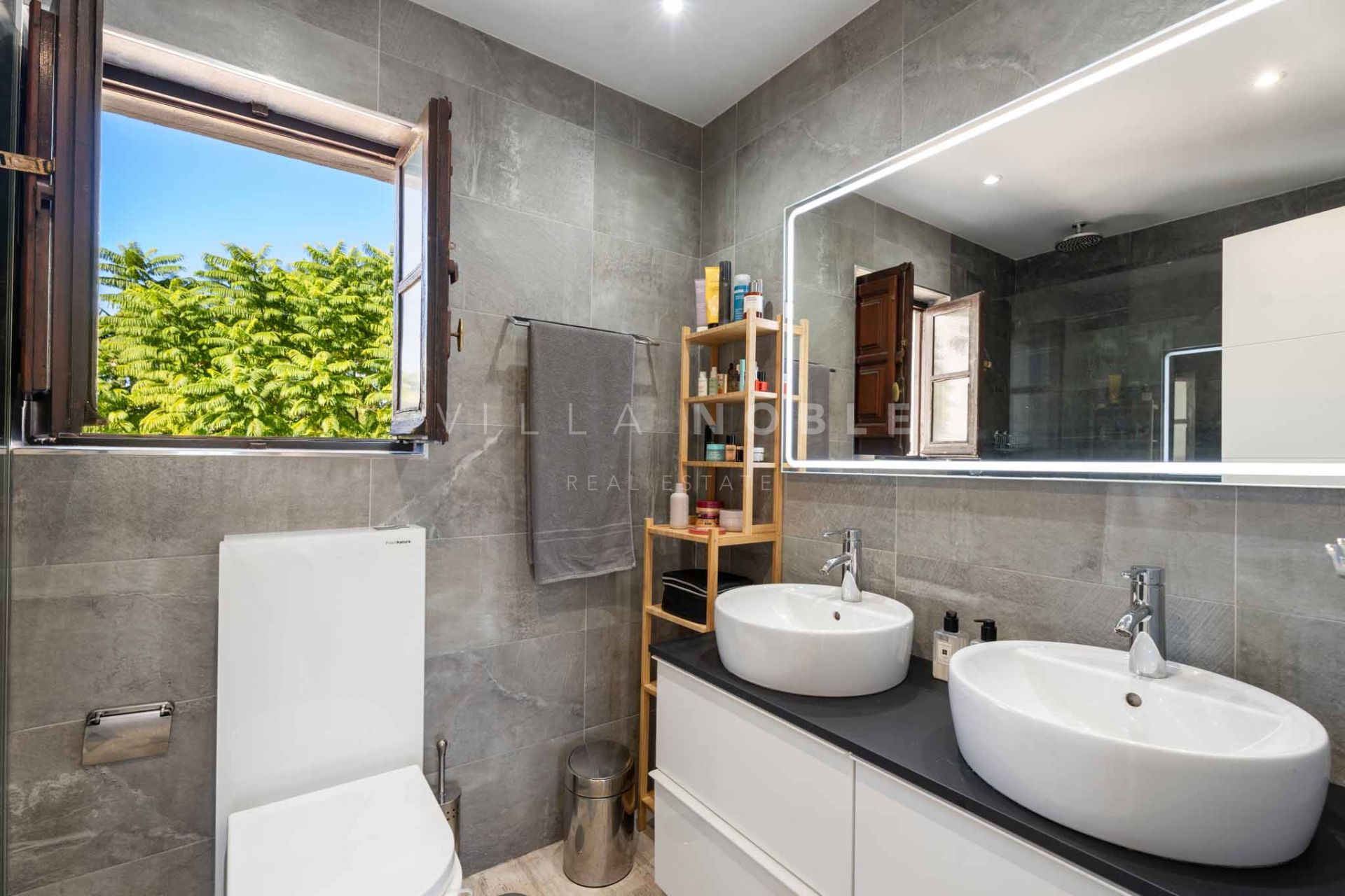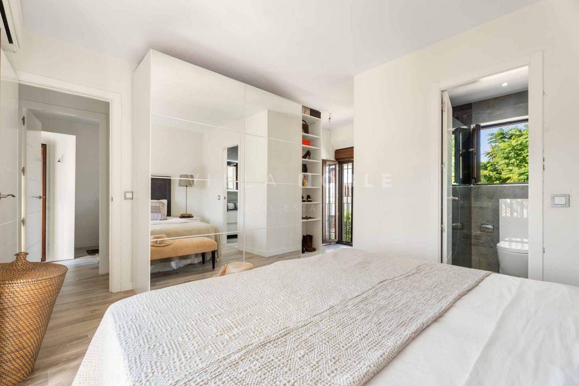 The home has been thoughtfully updated, blending Andalusian charm with modern comfort. The ground floor offers an open-plan living and dining area with a fireplace and direct access to a private terrace framed by Mediterranean greenery. A refurbished kitchen with contemporary finishes connects seamlessly to the living space, creating a functional and inviting layout.