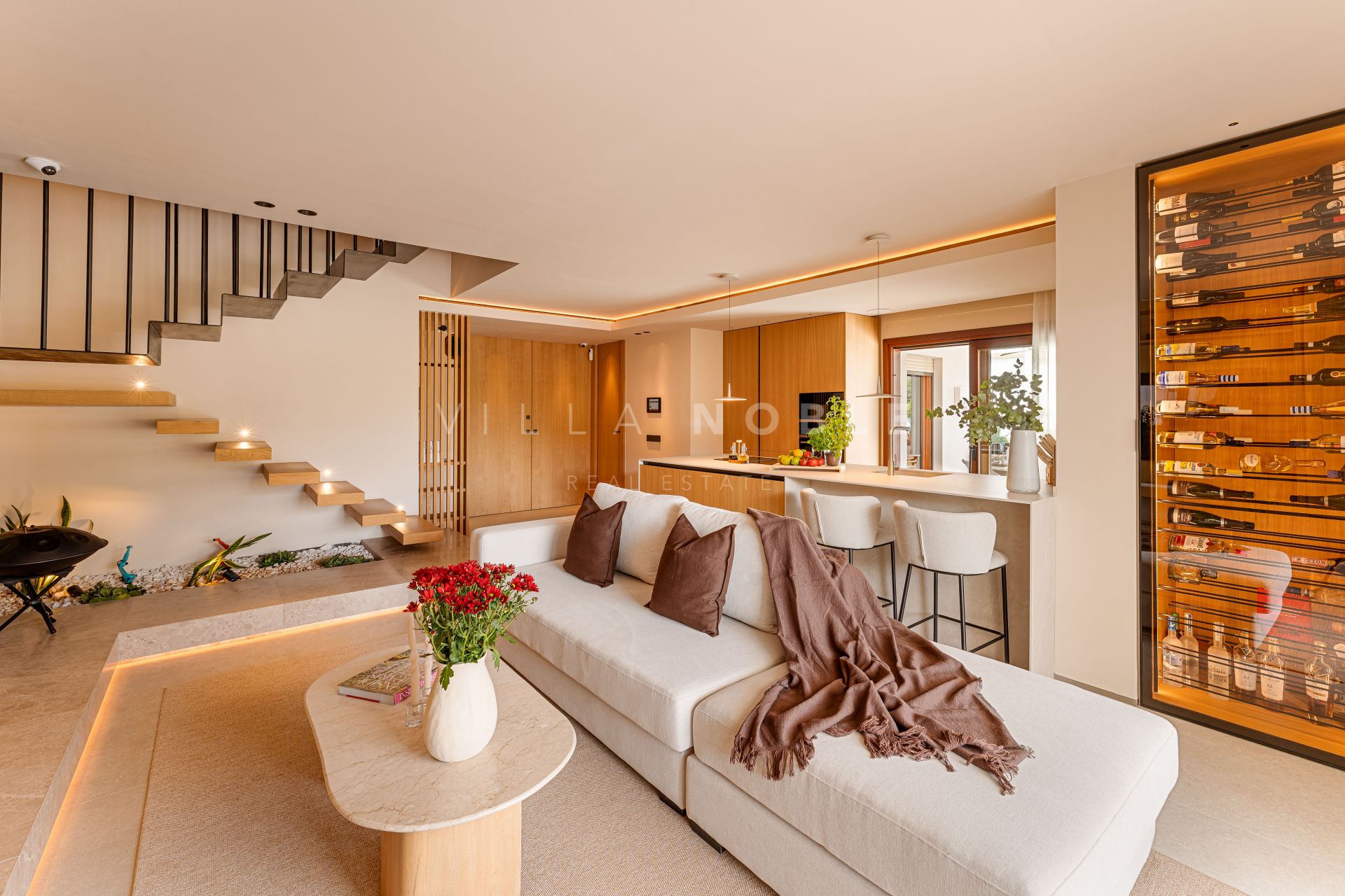 This duplex has been fully renovated to high- standards and equipped with state-of-the-art features, including air conditioning with an Air Zone system, underfloor heating, LED lighting, an integrated music system, and automated curtains, all easily controlled via a smart home automation system. Natural wood elements complement the clean lines, and integrated technology such as electric blinds and a smart security system with double-glazing and security shutters ensures a balance of ease and safety.