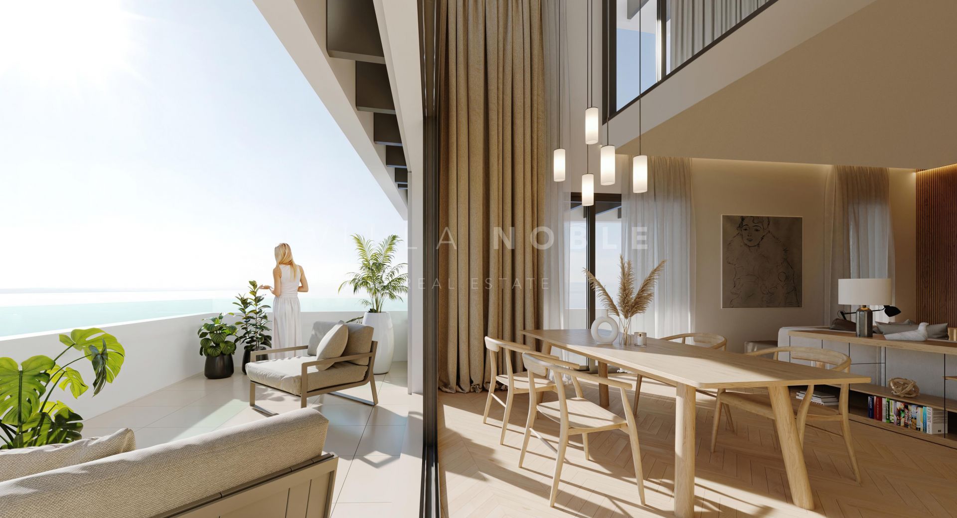 A luxurious three-bedroom, two-bathroom duplex penthouse with a guest toilet, 259 sqm of built space, and a 38 sqm terrace located fronline beach in West Malaga.