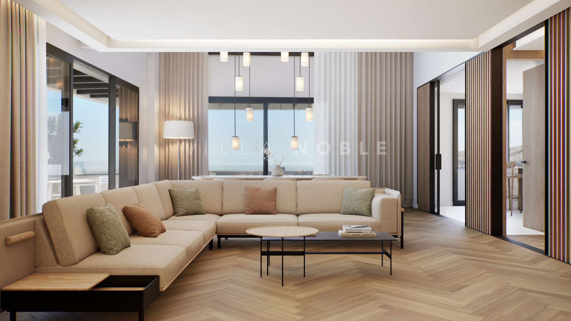 The double-height living area enhances the sense of space, allowing natural light to flood the interiors and emphasizing the spectacular sea views. The open-concept kitchen and living room serve as the heart of the home, designed with elegance, functionality, and premium finishes.
