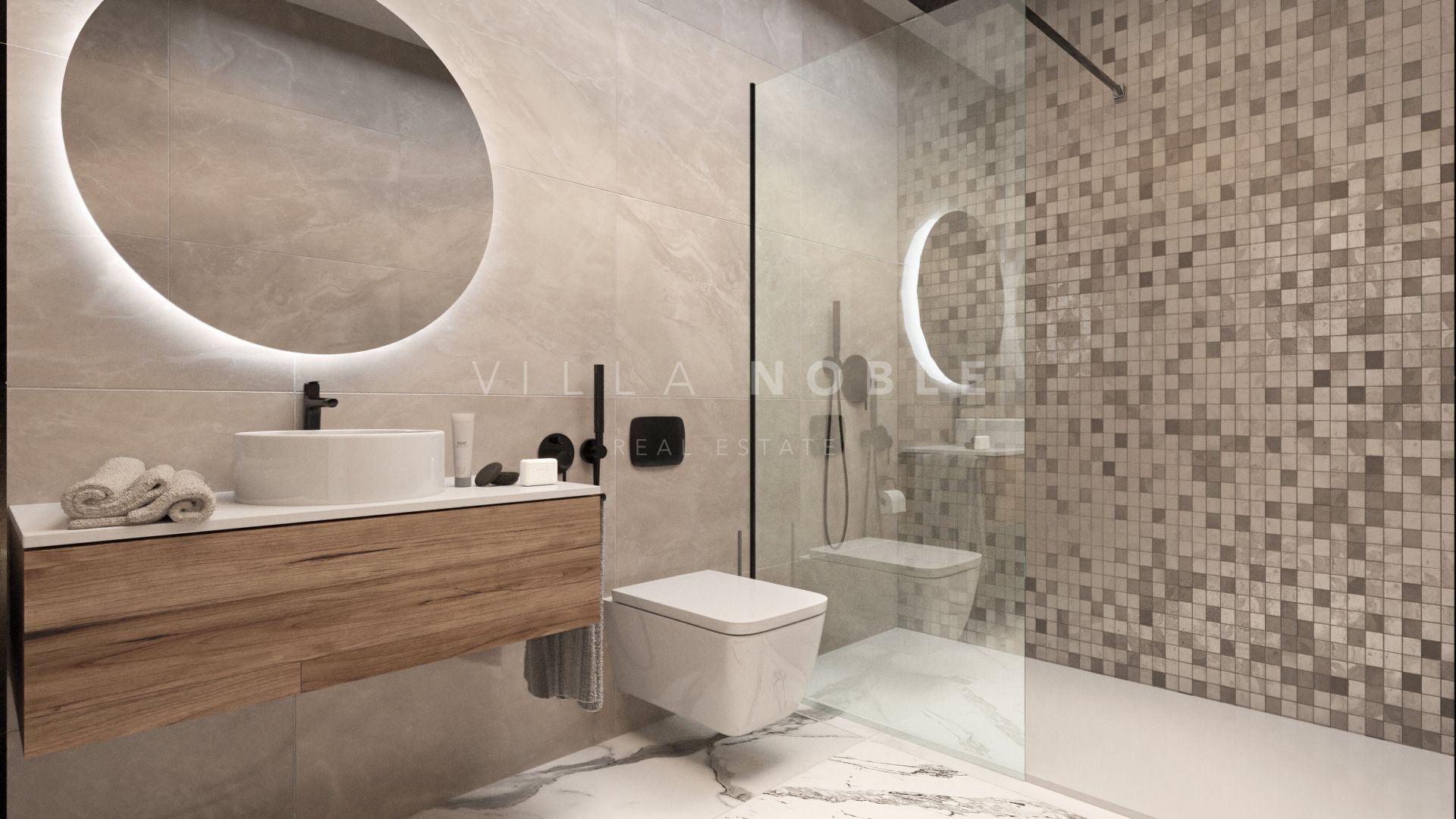 The villa’s interior is equally as impressive. The master bedroom boasts a spacious walk-in closet, providing ample storage space for your belongings. The open-plan living room seamlessly connects to the kitchen and dining area, making it the heart of the home. A cozy fireplace adds a touch of warmth to the space, while large, glass, sliding doors lead out to the terrace, creating a harmonious indoor-outdoor living experience.