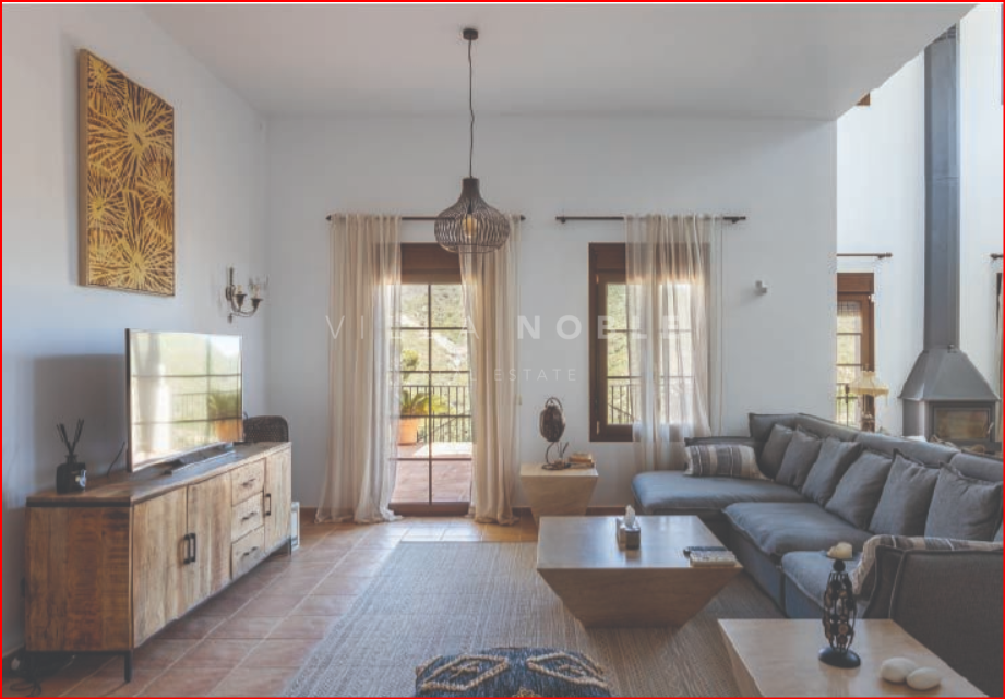 The property features 6 bedrooms, 6 bathrooms, a constructed area of 590 m², a 150 m² terrace, and a 2,379 m² plot with a landscaped garden. Positioned in a mountain setting near golf courses and woodland areas, the villa faces east and includes a private pool, air conditioning, and underfloor heating. Views include the sea, surrounding mountains, countryside, and forest areas.