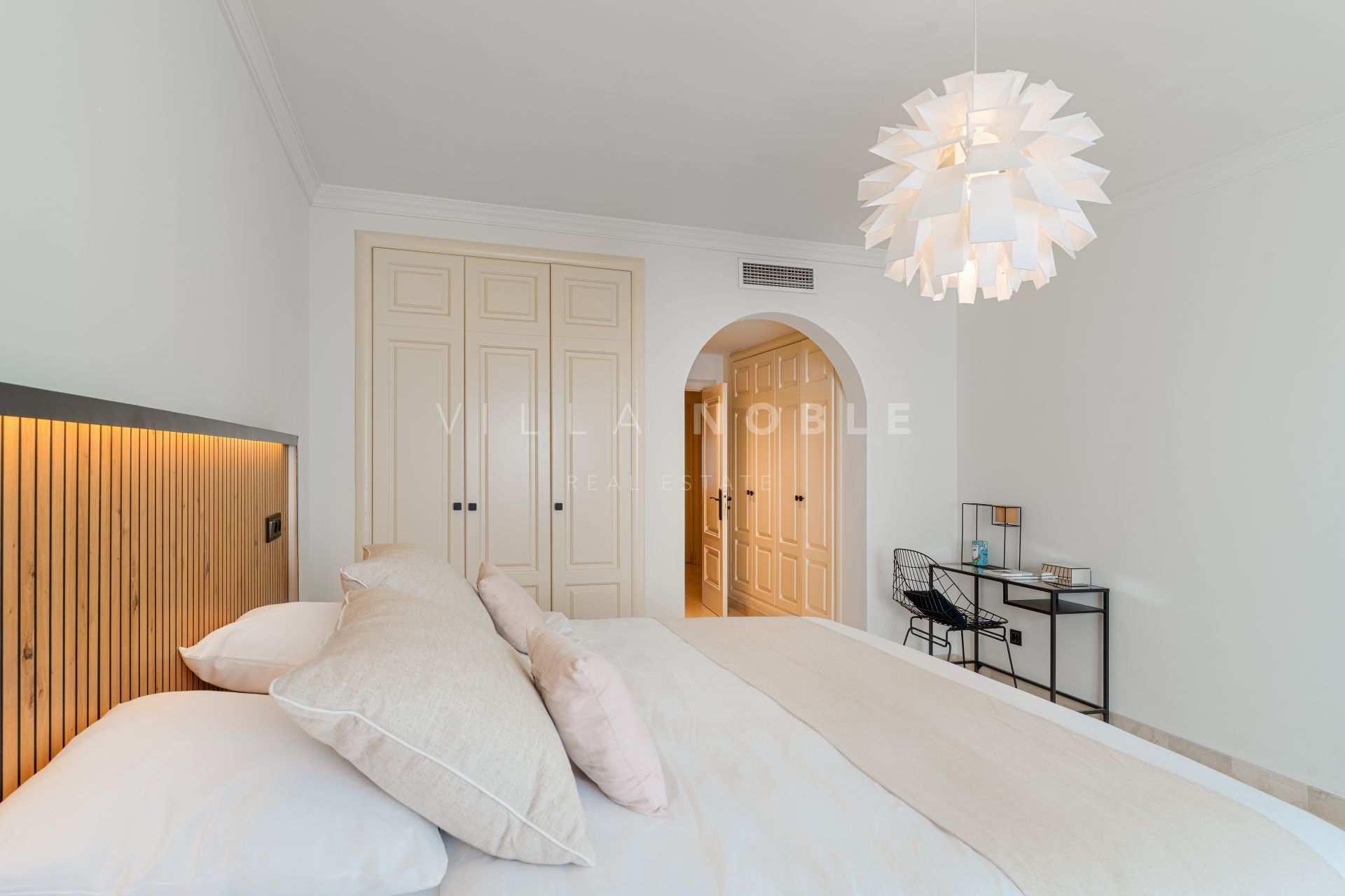 The master suite stands out for its generous walk-in dressing room and spa-style bathroom a sanctuary of calm and sophistication. The interiors display a timeless contemporary aesthetic, with marble floors, and a palette combining warmth and modernity. The result is an environment that feels luxurious yet welcoming, where every material has been carefully chosen to enhance both form and function.
