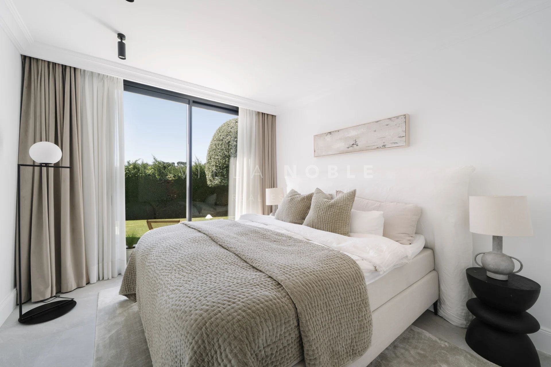 Set in Nueva Andalucía, this southwest-facing, five-bedroom villa blends Andalusian charm with modern comfort. Fully renovated, it captures natural light throughout the day, offering expansive terraces, a private pool, and lush green surroundings. Upstairs, the bedrooms enjoy open views of the golf course, creating a peaceful and scenic retreat.