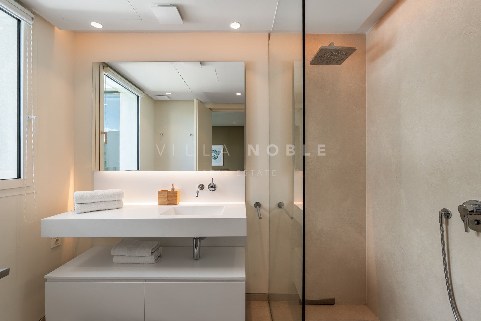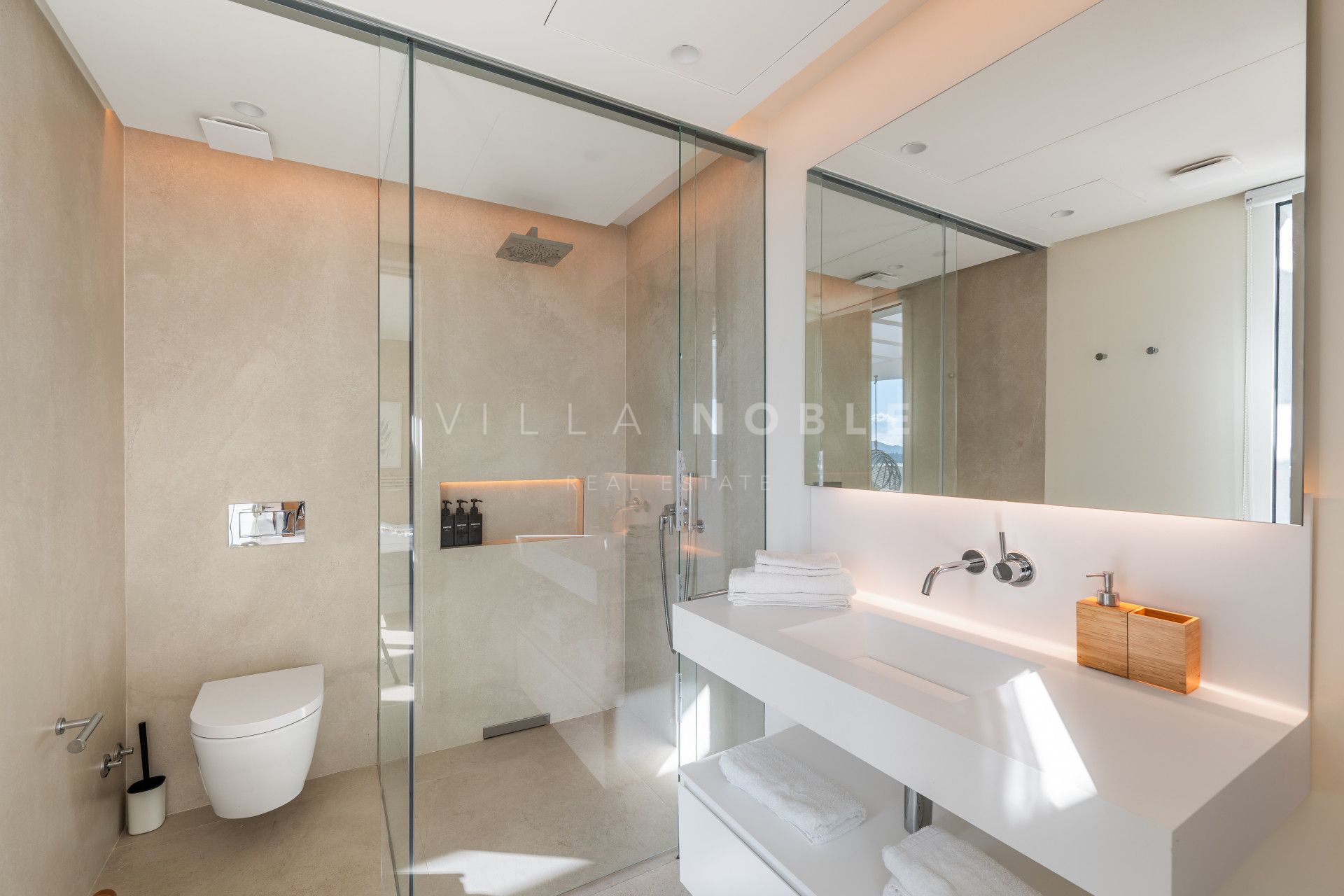 The apartment features two beautifully appointed bedrooms and two luxurious bathrooms, both equipped with walk-in showers and underfloor heating. The master suite is a private haven, enjoying direct access to the expansive terrace and complemented by an elegant en-suite bathroom. A second bedroom and guest bathroom provide equally refined accommodation for family or visitors.