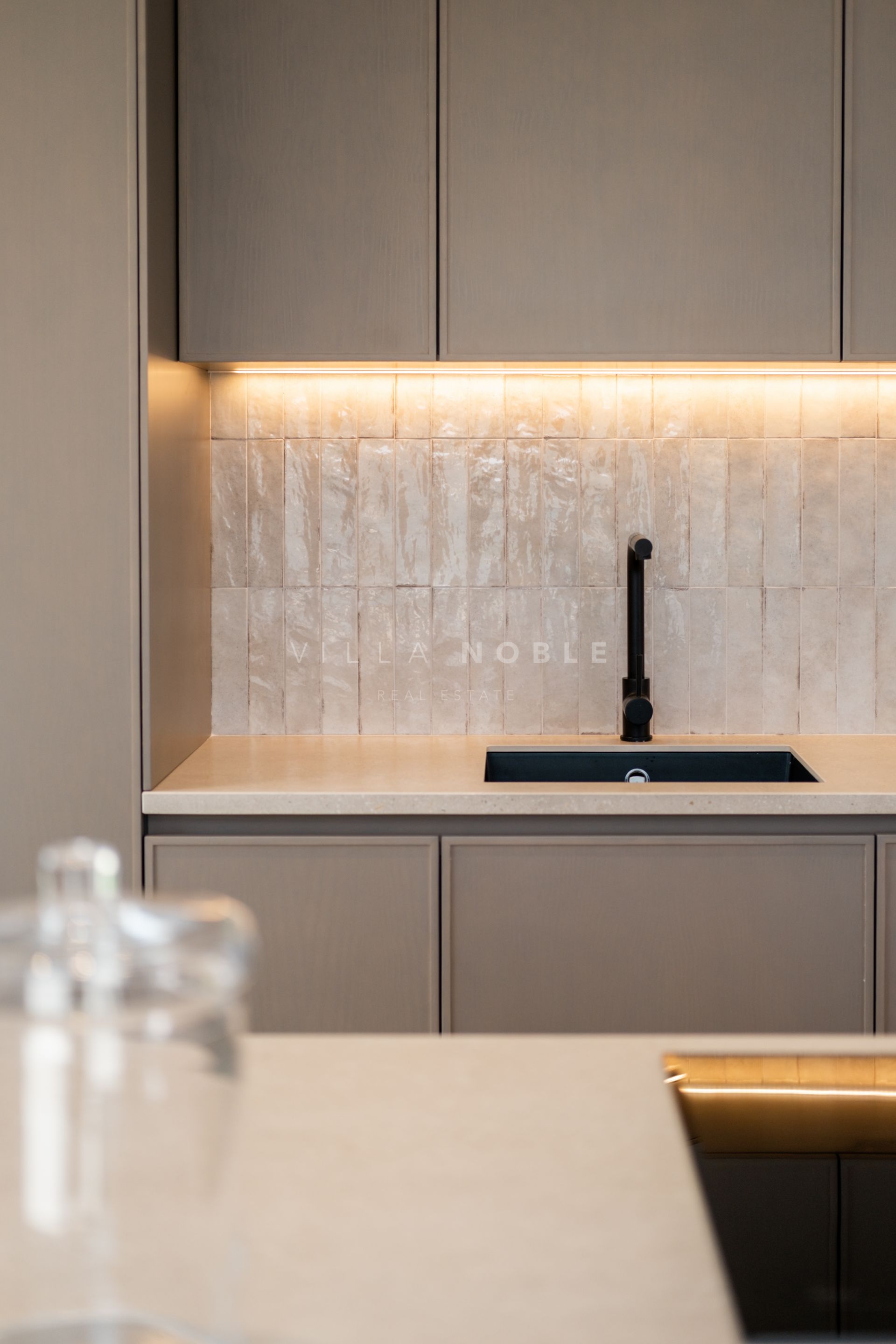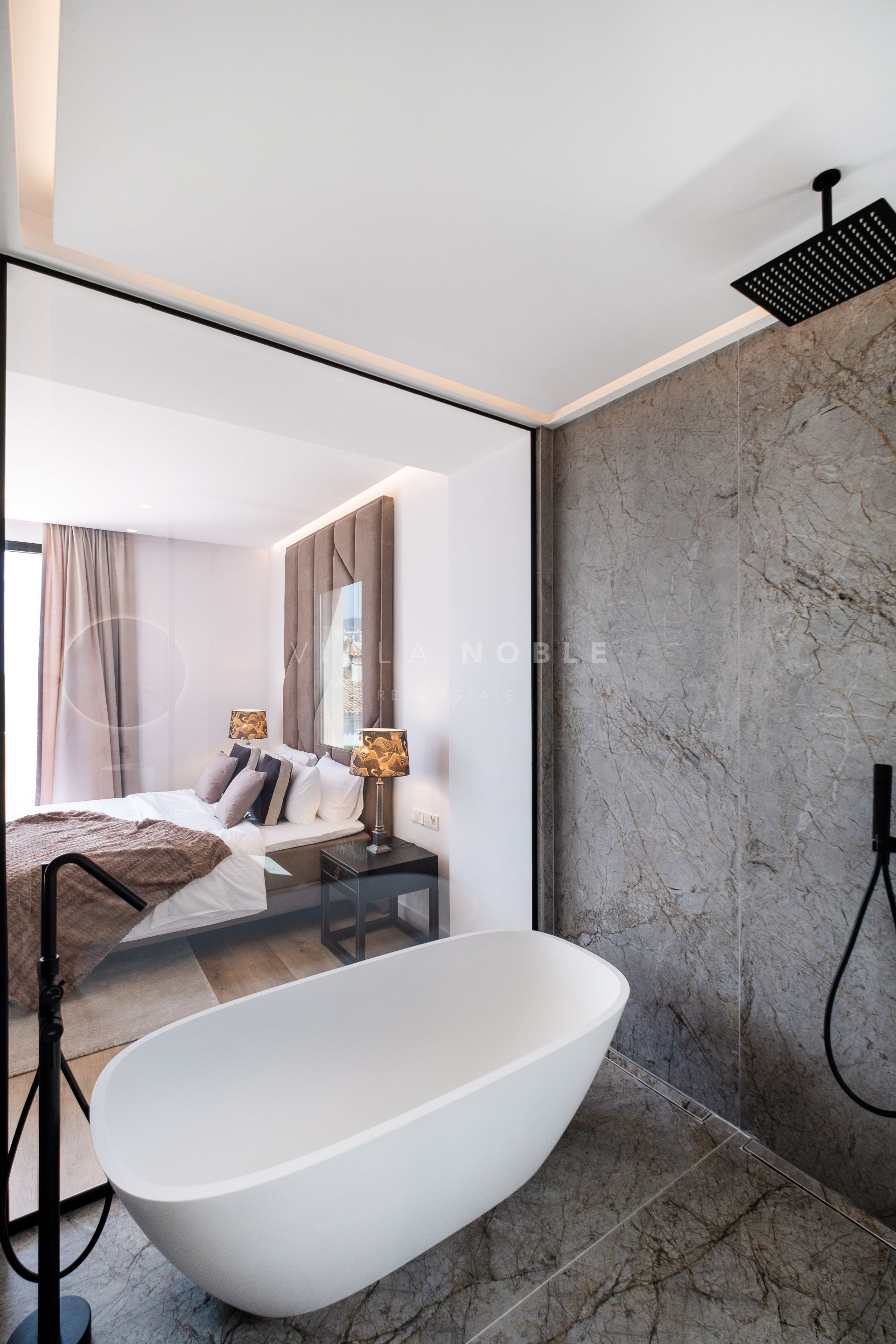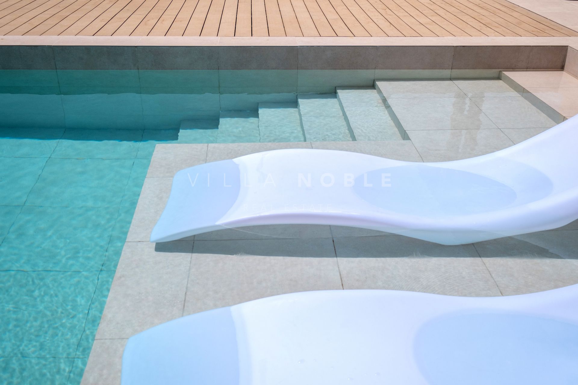 This property’s outdoor spaces are as inviting as its interiors. The covered terrace leads to a landscaped garden and features an infinity pool that enhances the panoramic sea views. Integrated sunbeds provide an ideal spot for soaking up the Mediterranean sun, while a sundeck, pergola, BBQ area, and chill-out spaces create a perfect atmosphere for social gatherings or peaceful relaxation. As the day winds down, the sunset terrace offers an ideal setting for movie nights under the stars with its unique moonlight cinema.