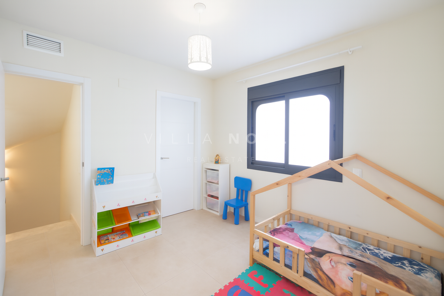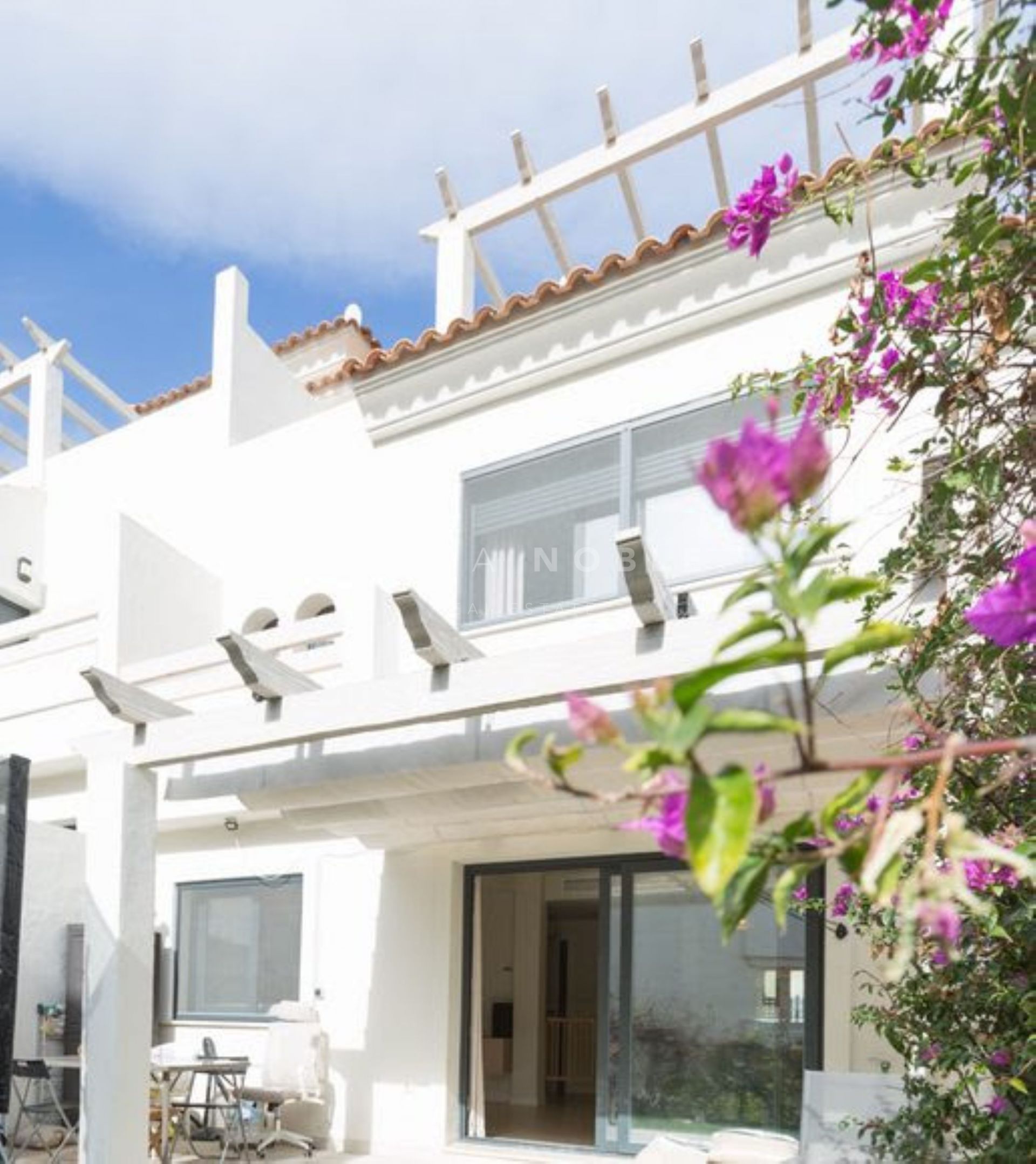 The interiors stand out for their high-end materials, such as porcelain floors, design kitchen and elegant finishes that elevate the daily life experience. The house is integrated in a very quiet, caring and family complex, surrounded by gardens and with communal pool. A serene and pleasant environment, ideal for those looking for quality of life, privacy and proximity to golf and all services.