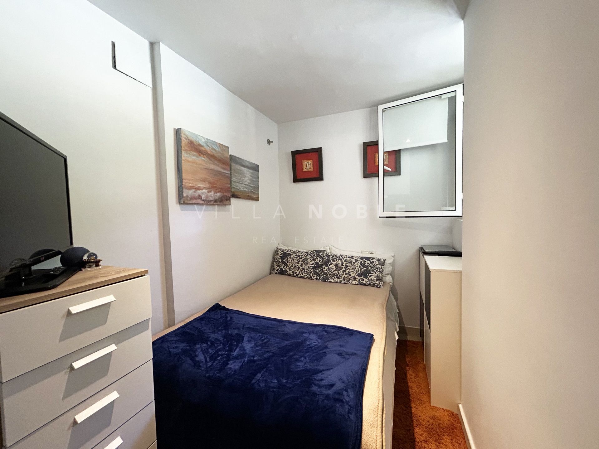 The property has two master bedrooms, both with en-suite bathrooms, and a guest toilet. A staff bedroom has been added, reducing the size of the original large kitchen. Marble floors, air conditioning with heat pump, a safe, a garage, and a storage room are some of the additional features this apartment offers.
