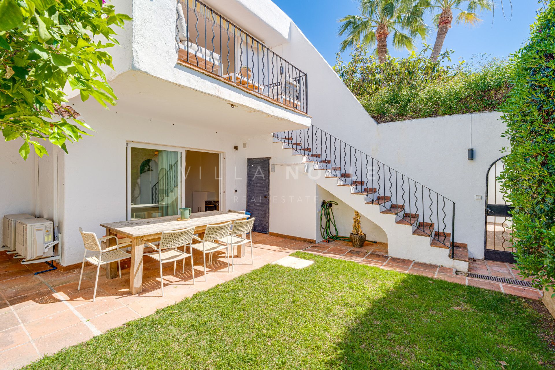 Outside, there is a private garden with an outdoor dining area, while the communal swimming pool is just steps from the property.