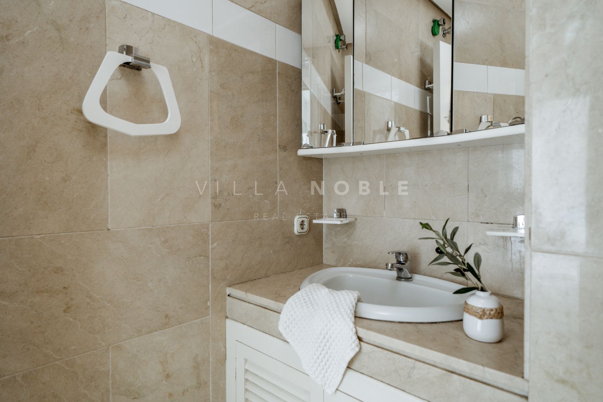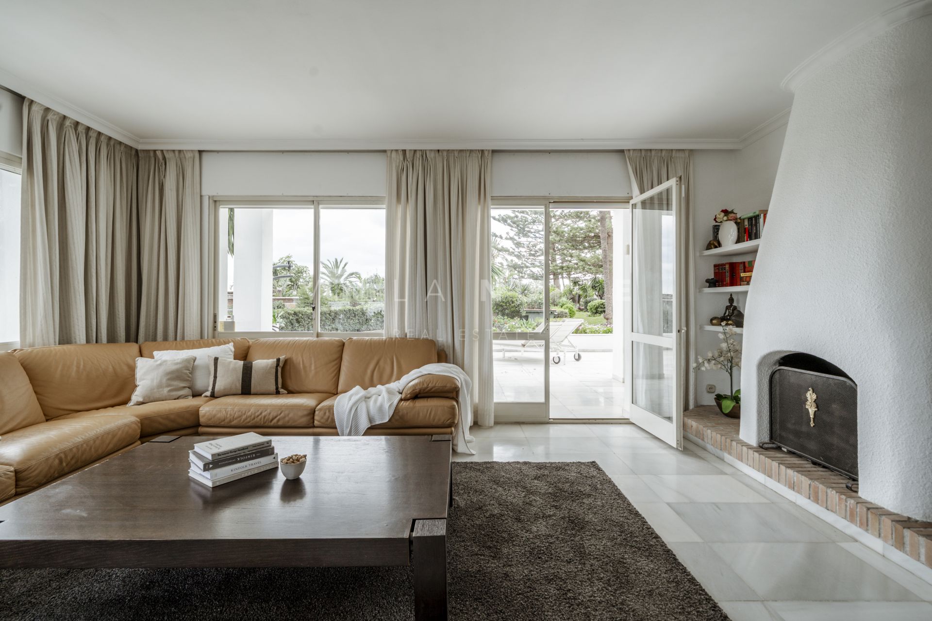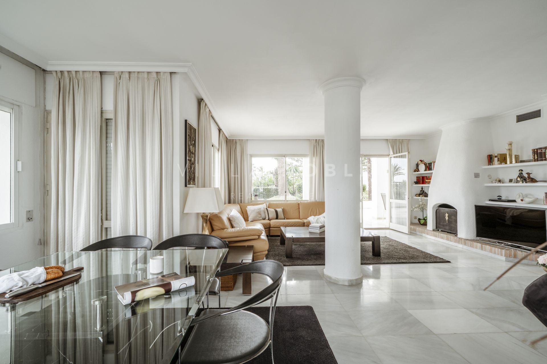 The interior is a blend of sophisticated charm and functionality, featuring elegant marble flooring throughout, a cozy fireplace, and beautifully designed marble bathrooms. The expansive open-plan living and dining area is bathed in natural light, while the wrap-around marble terrace offers an ideal space for outdoor dining or simply unwinding amidst nature, with glimpses of the sea.