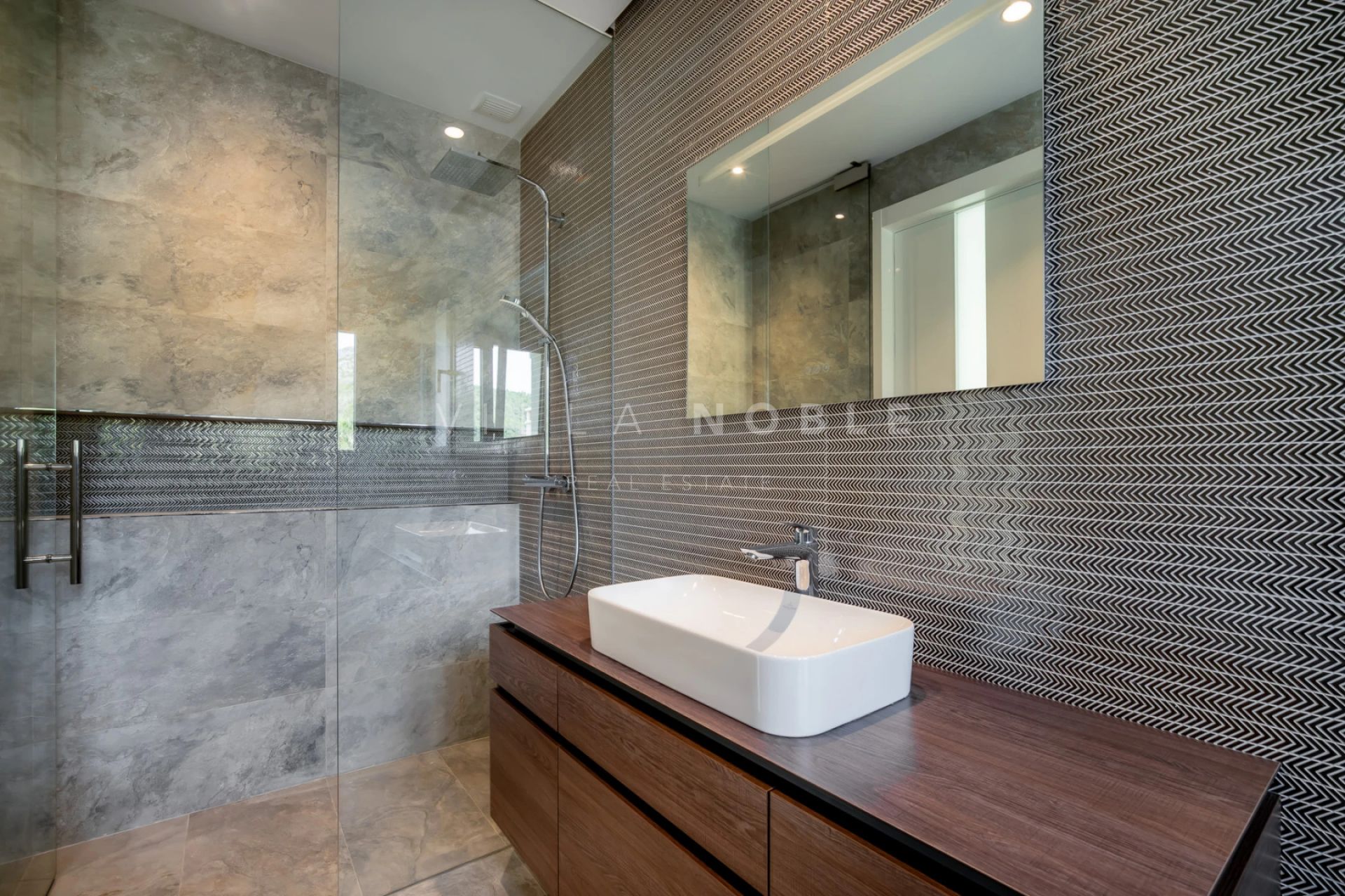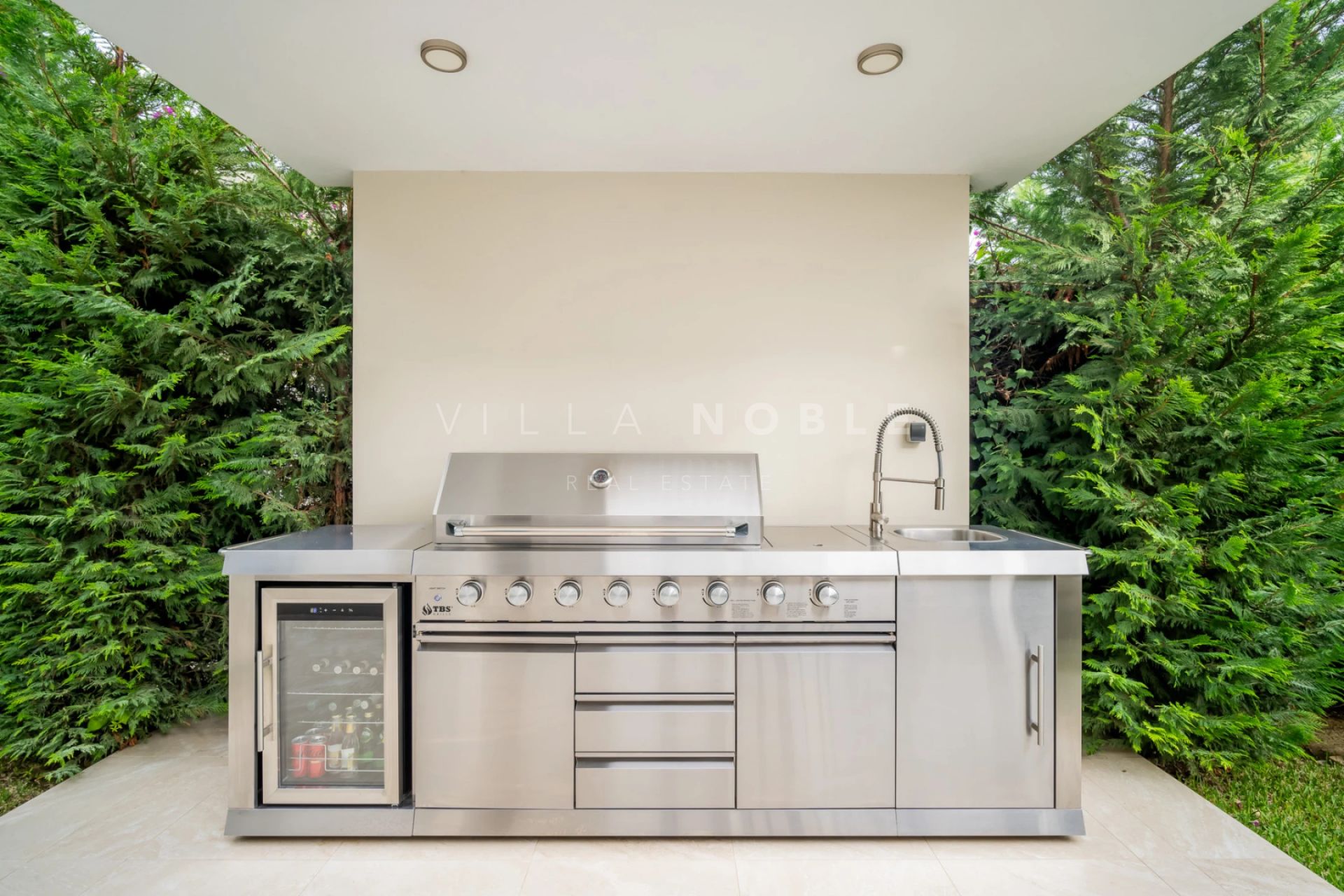 The property boasts expansive terrace spaces designed for alfresco dining and relaxing, complemented by a private outdoor pool and a fully equipped outdoor kitchenette with a barbecue. The ground level seamlessly integrates indoor and outdoor living with direct access to the terraces, providing the perfect setting for entertaining or unwinding. Inside, the home features Italian furnishings, a cosy lounge area, a spacious dining room with a wine bodega, and a modern kitchen with ample storage. The master bedroom is a standout, offering breathtaking views, a grand en-suite bathroom, and a serene retreat for its occupants.