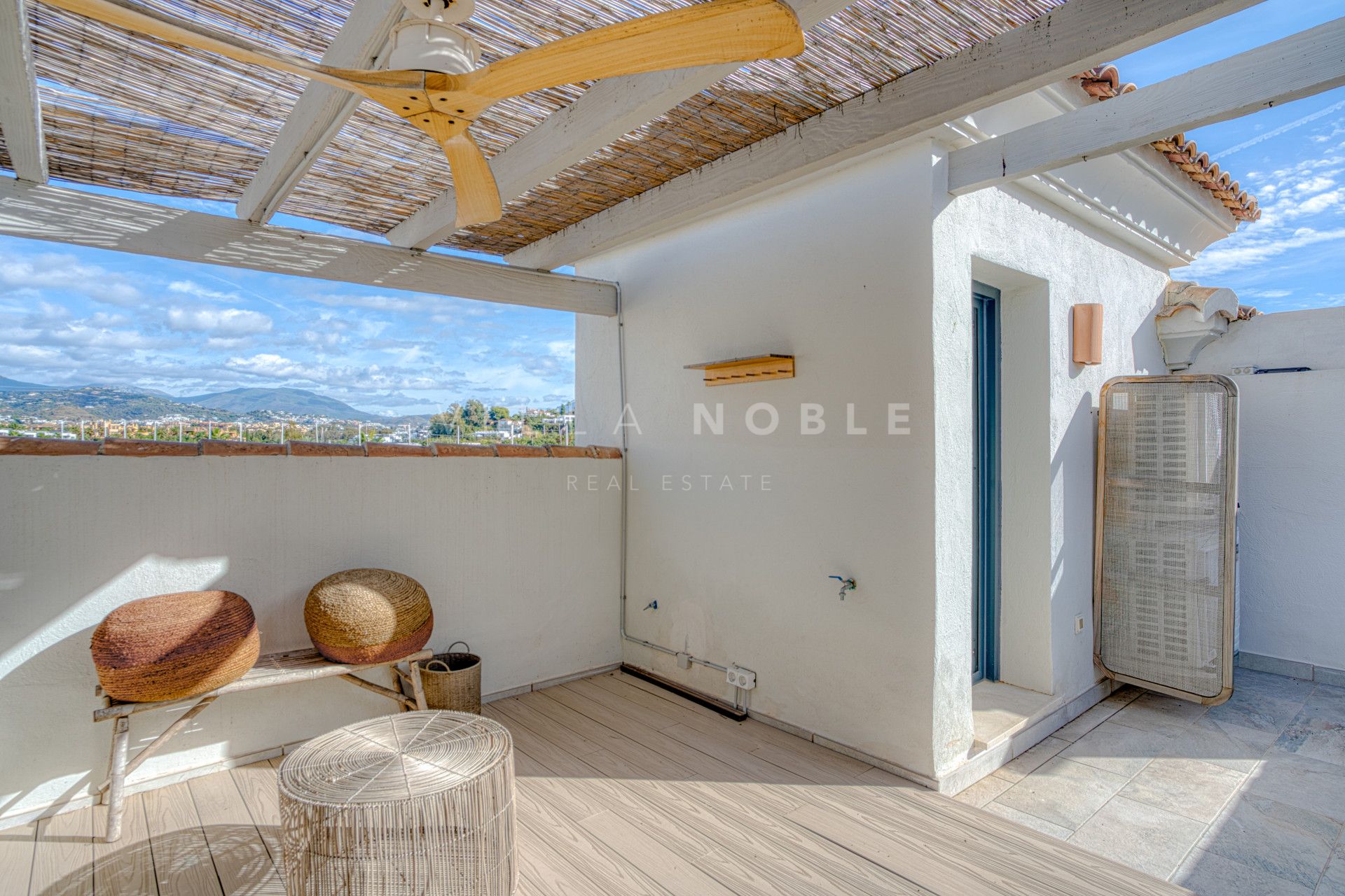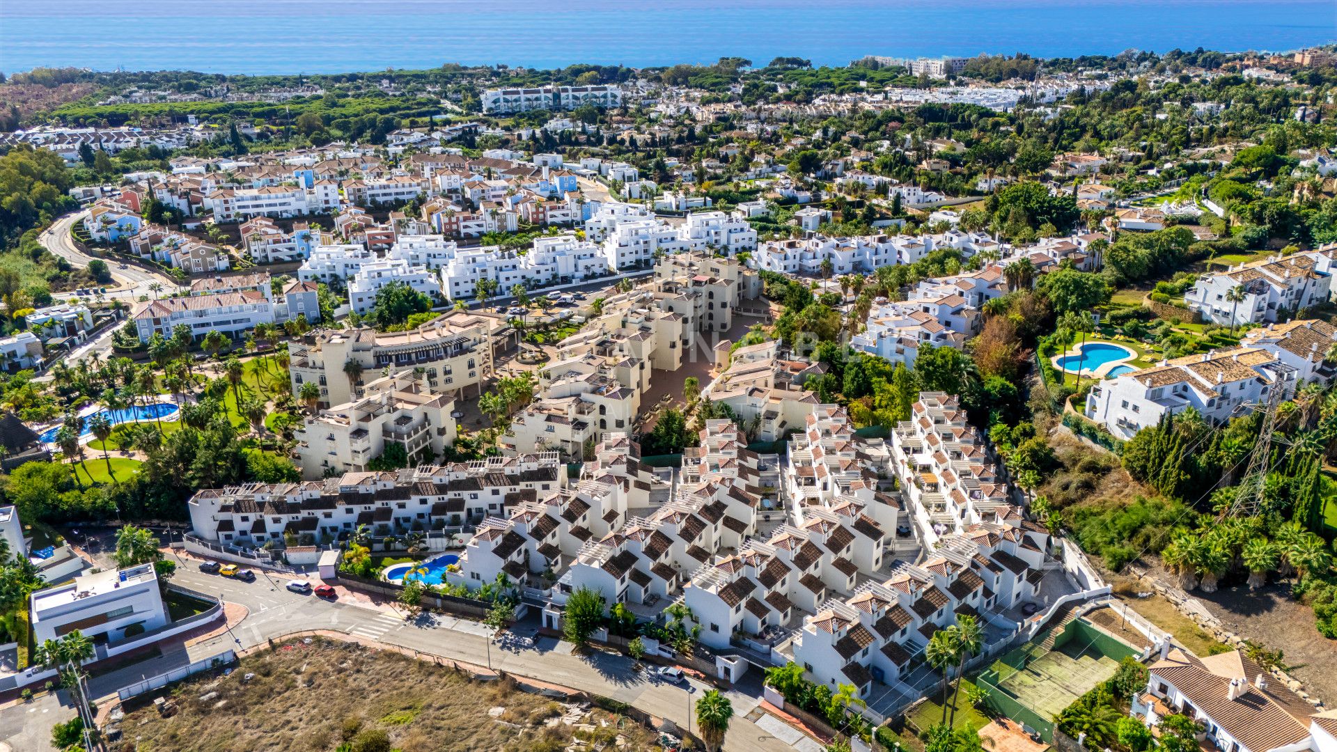 Elegante casa adosada de tres dormitorios ubicada en la urbanización cerrada Agra Residencial, un encantador complejo de estilo mediterráneo con 47 amplias viviendas junto a El Campanario Golf & Country Club, en el corazón del prestigioso Triángulo de Oro de Estepona.