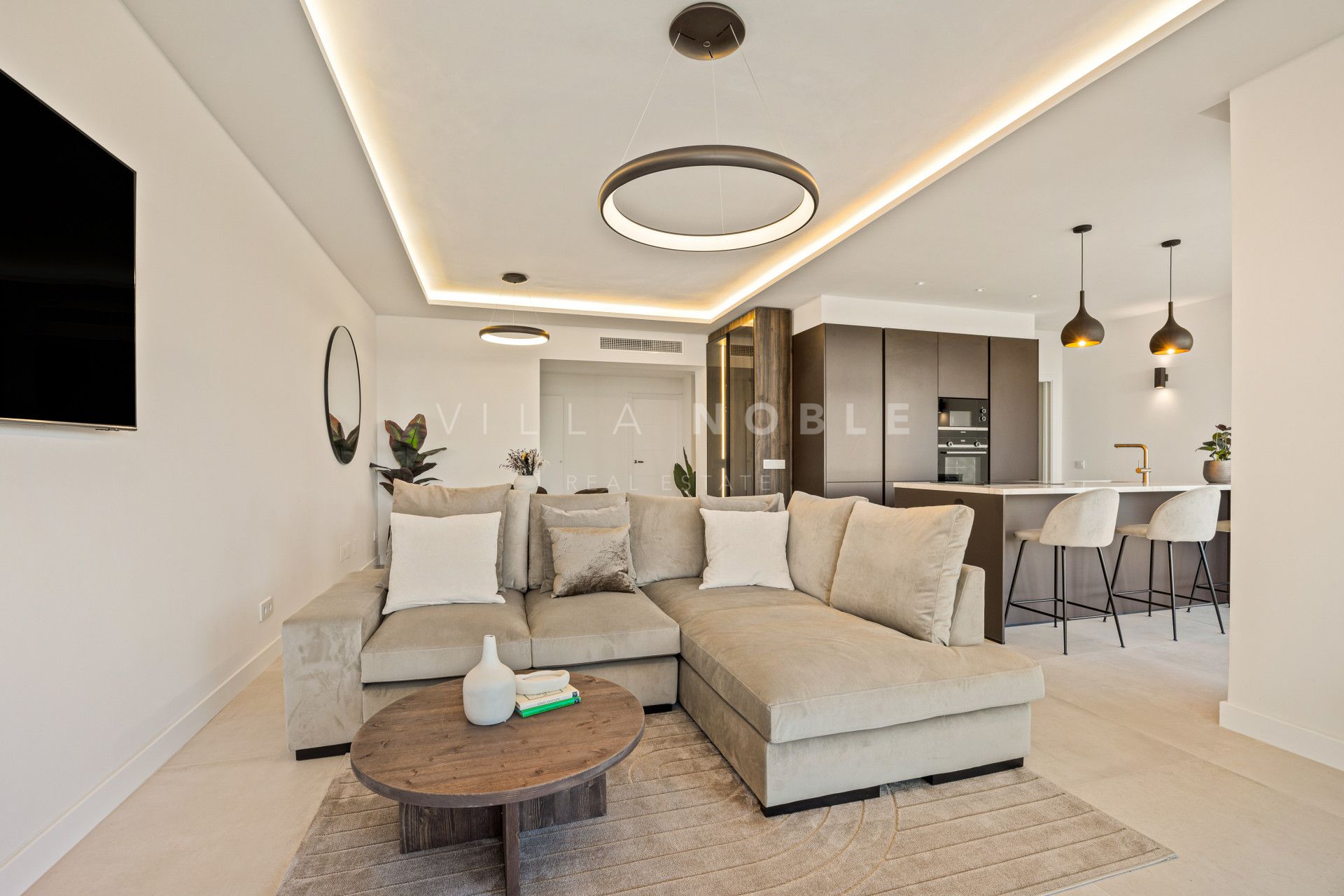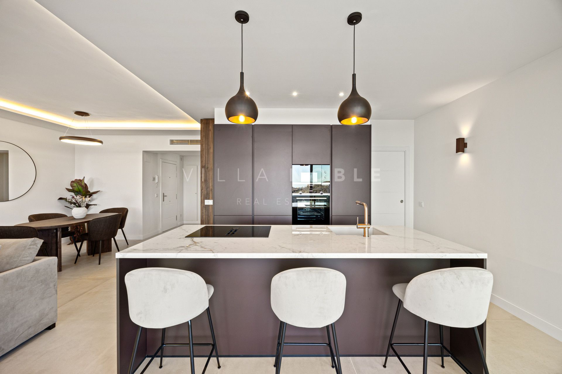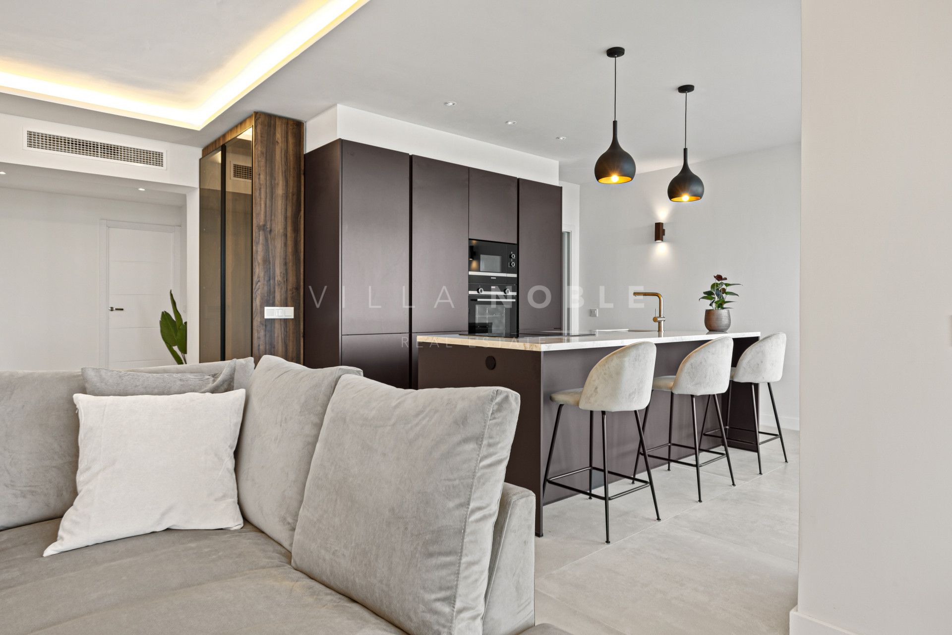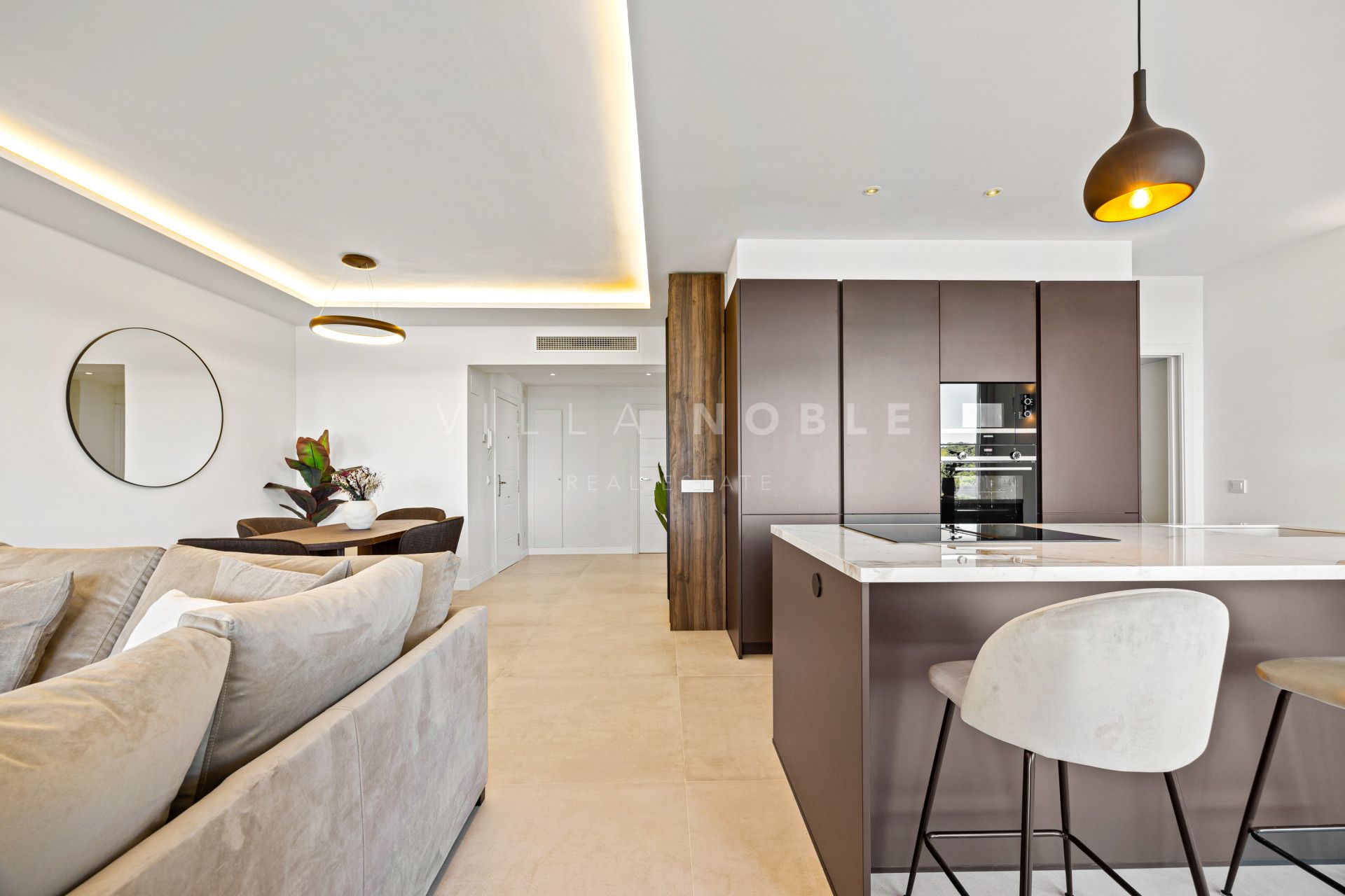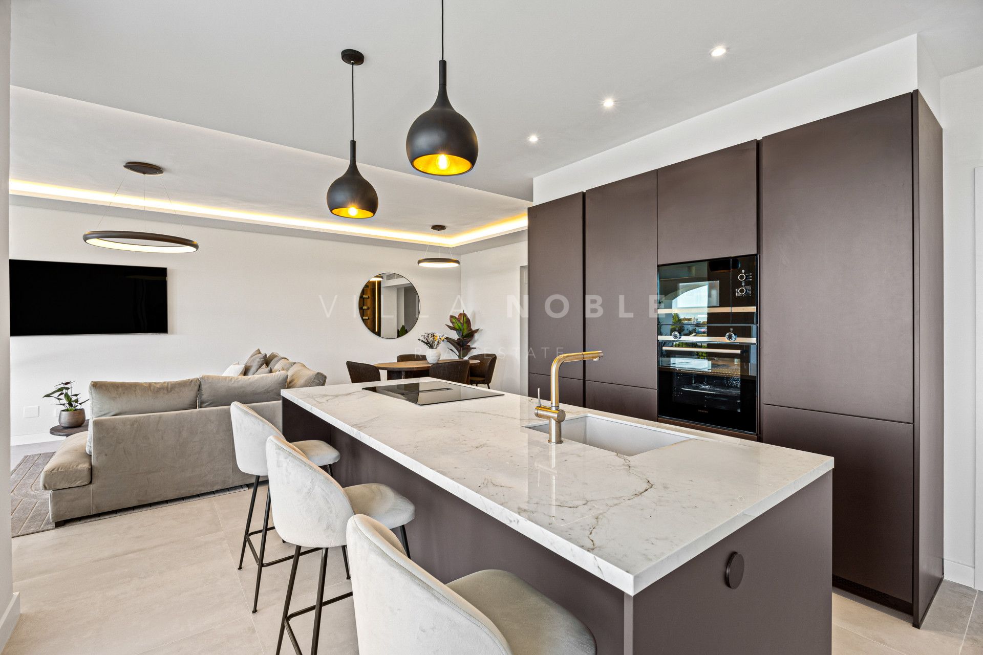 El interior combina líneas arquitectónicas limpias con una suave luz natural, creando un ambiente tranquilo y moderno. Una sala de estar de planta abierta conecta con una cocina de diseño con una isla central de mármol, ideal para recibir invitados o relajarse en un ambiente tranquilo y confortable. La terraza principal extiende el espacio al exterior, con iluminación integrada y una zona de estar ideal para las cálidas tardes andaluzas.