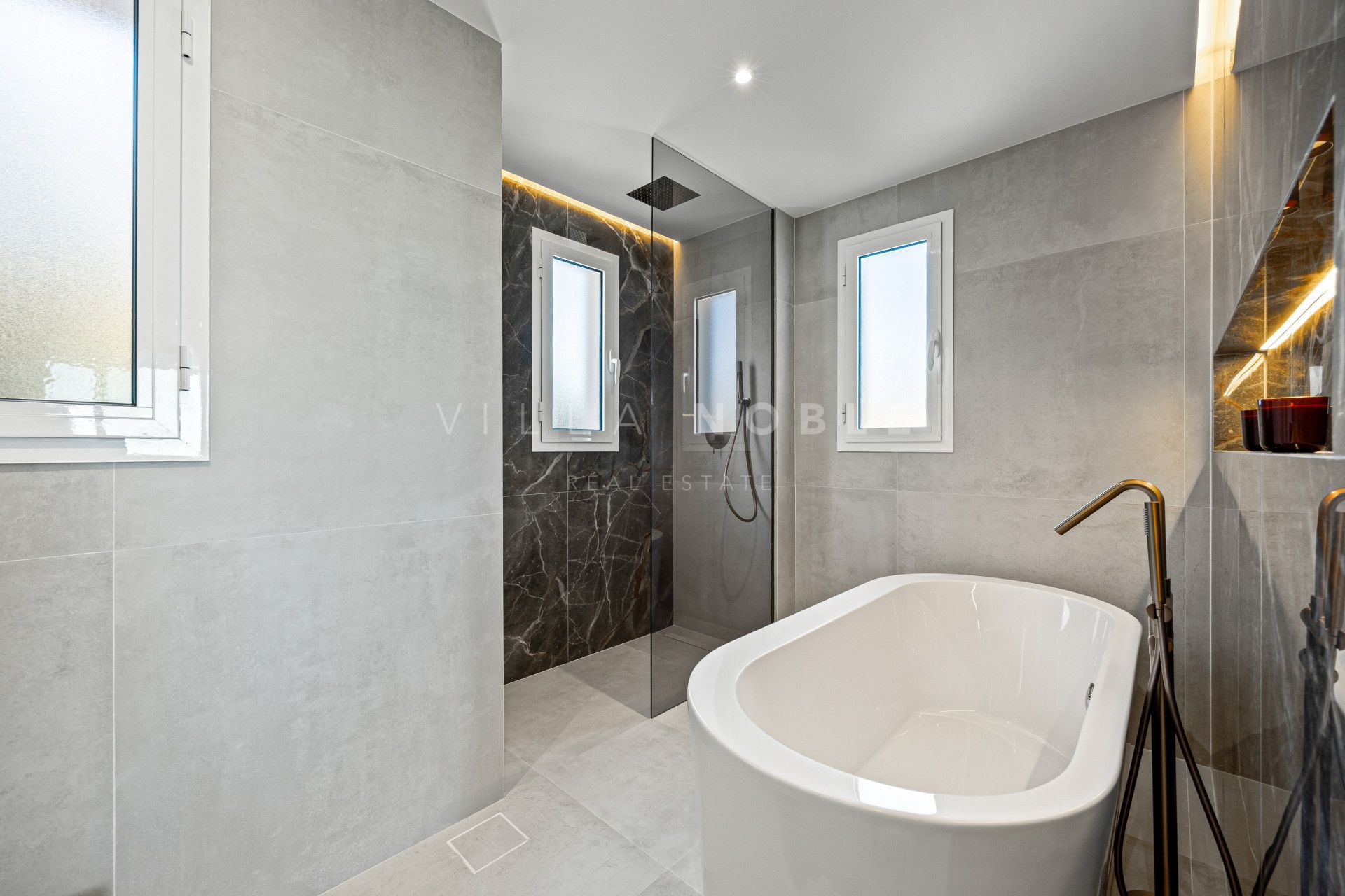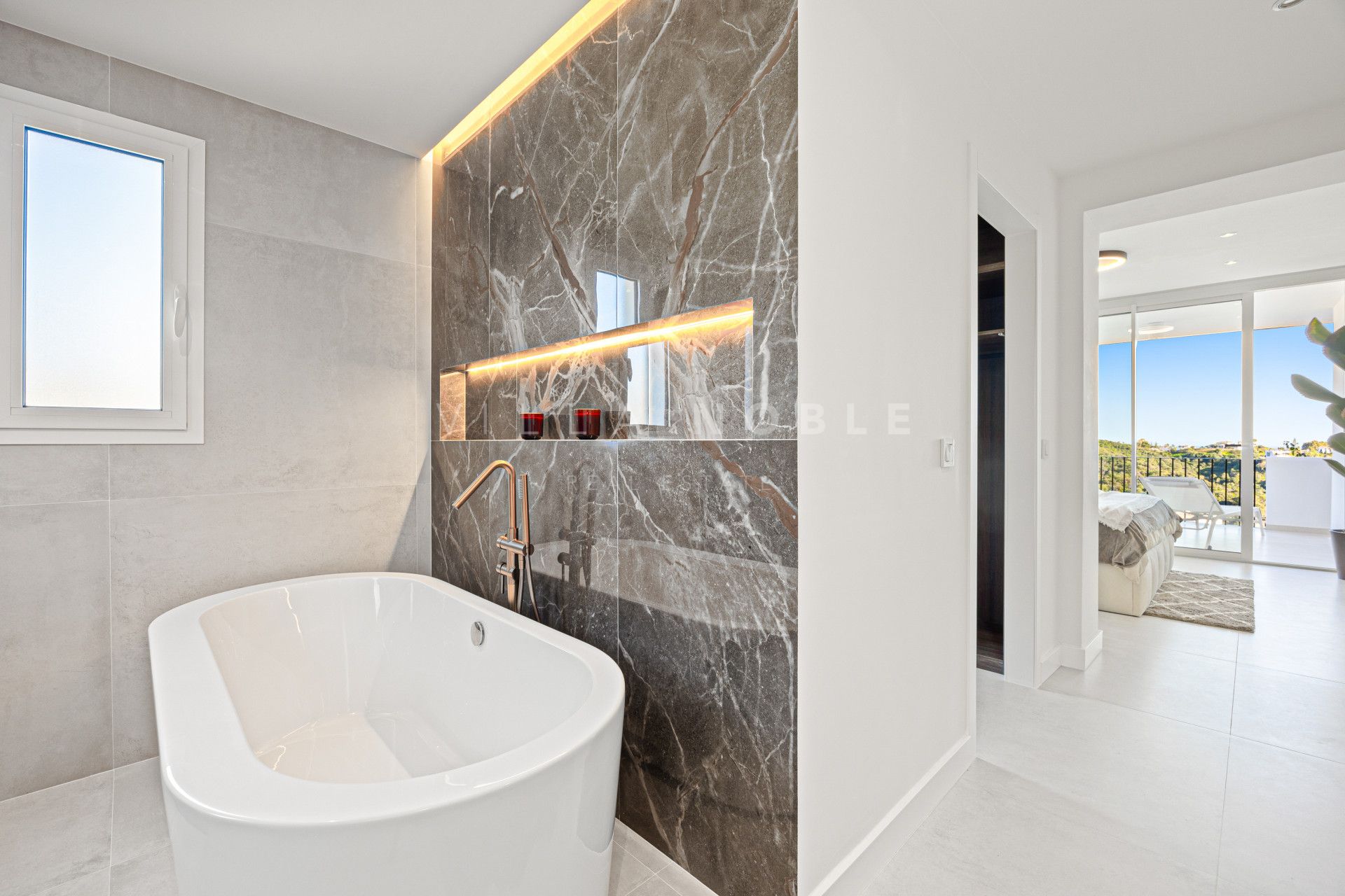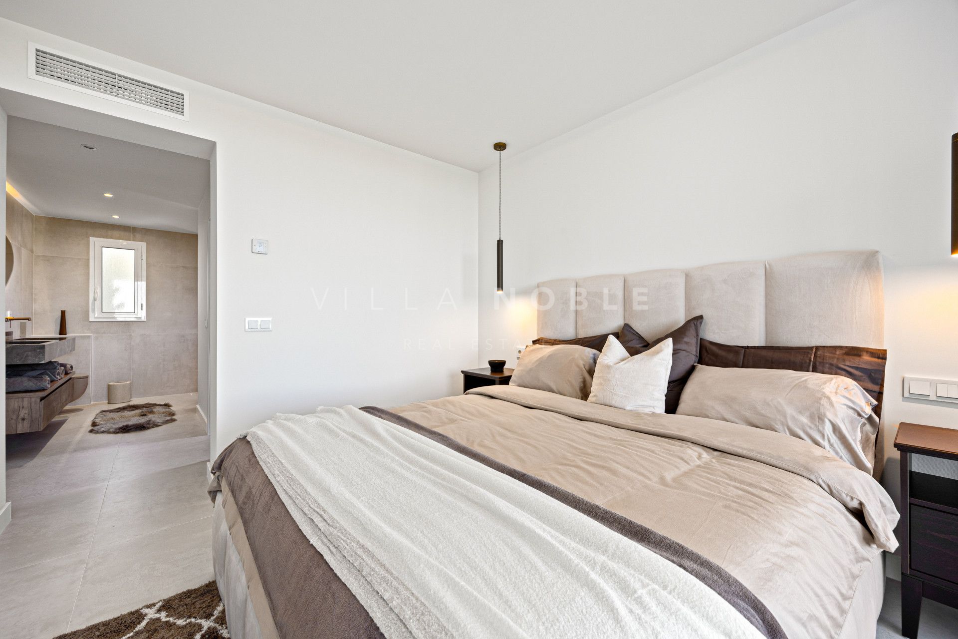 La suite principal está diseñada pensando en la privacidad, con acceso directo a la terraza, vestidor y un baño completo con bañera exenta y ducha a ras de suelo. Dos dormitorios adicionales, uno de ellos con baño en suite, ofrecen comodidad para invitados o familiares.