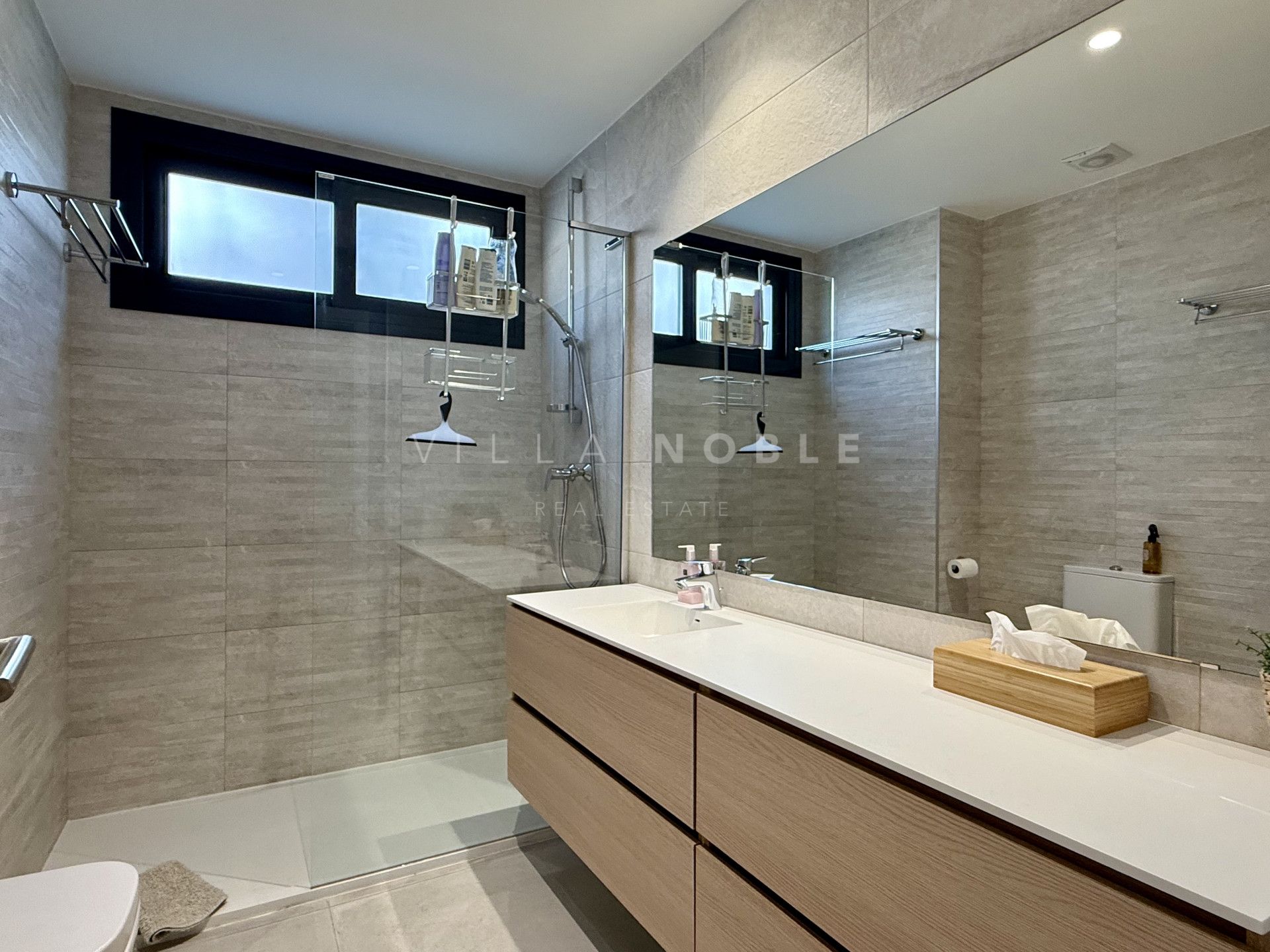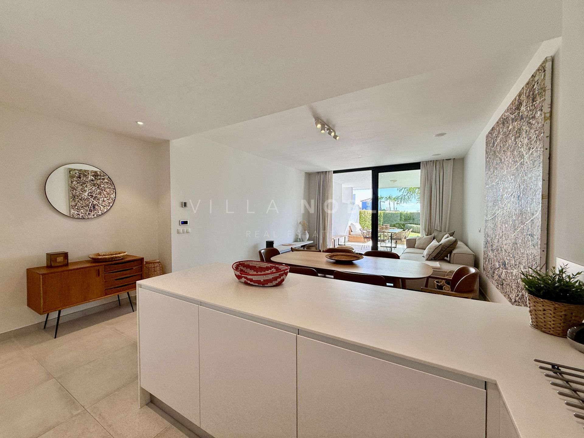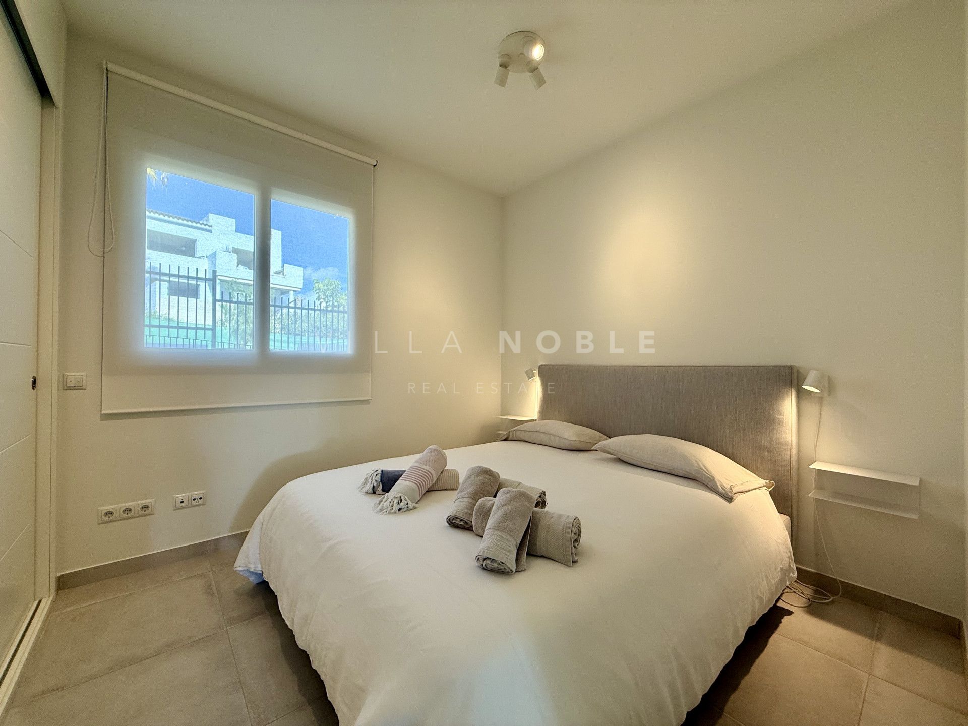 Esta comunidad cerrada y segura ofrece paz y tranquilidad, a la vez que se encuentra convenientemente cerca de todos los servicios, como tiendas, colegios, restaurantes y excelentes campos de golf. La propiedad consta de tres amplios dormitorios y dos baños con suelo radiante, además de un aseo de invitados. El recibidor conduce directamente al salón-comedor y a una cocina americana totalmente equipada, que da a una encantadora terraza cubierta y a un jardín privado. Con orientación suroeste, disfruta de luz natural durante todo el día.