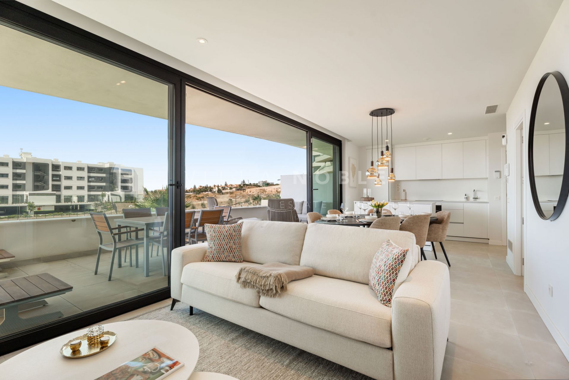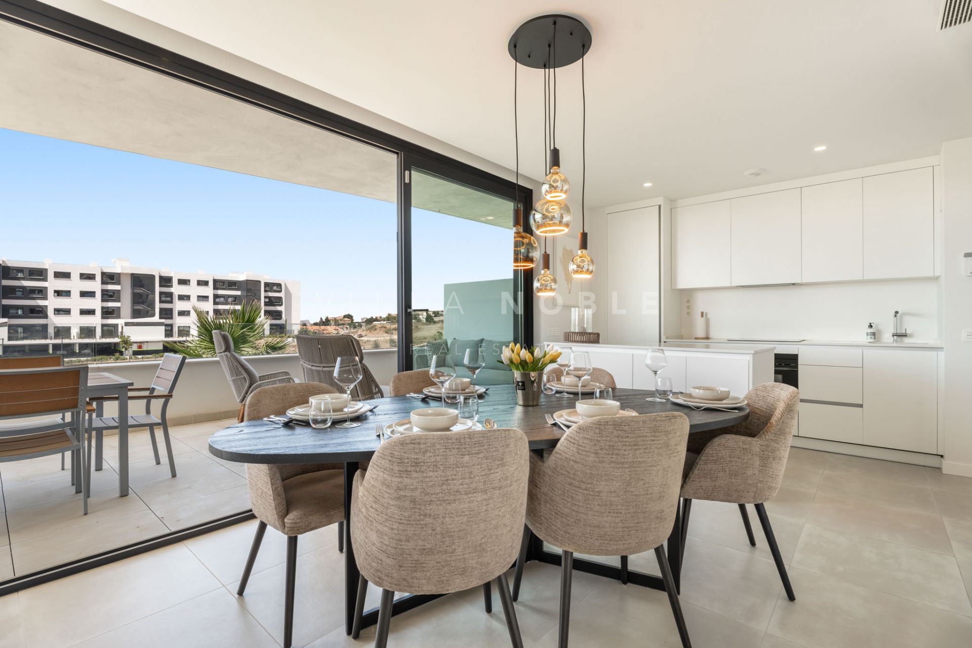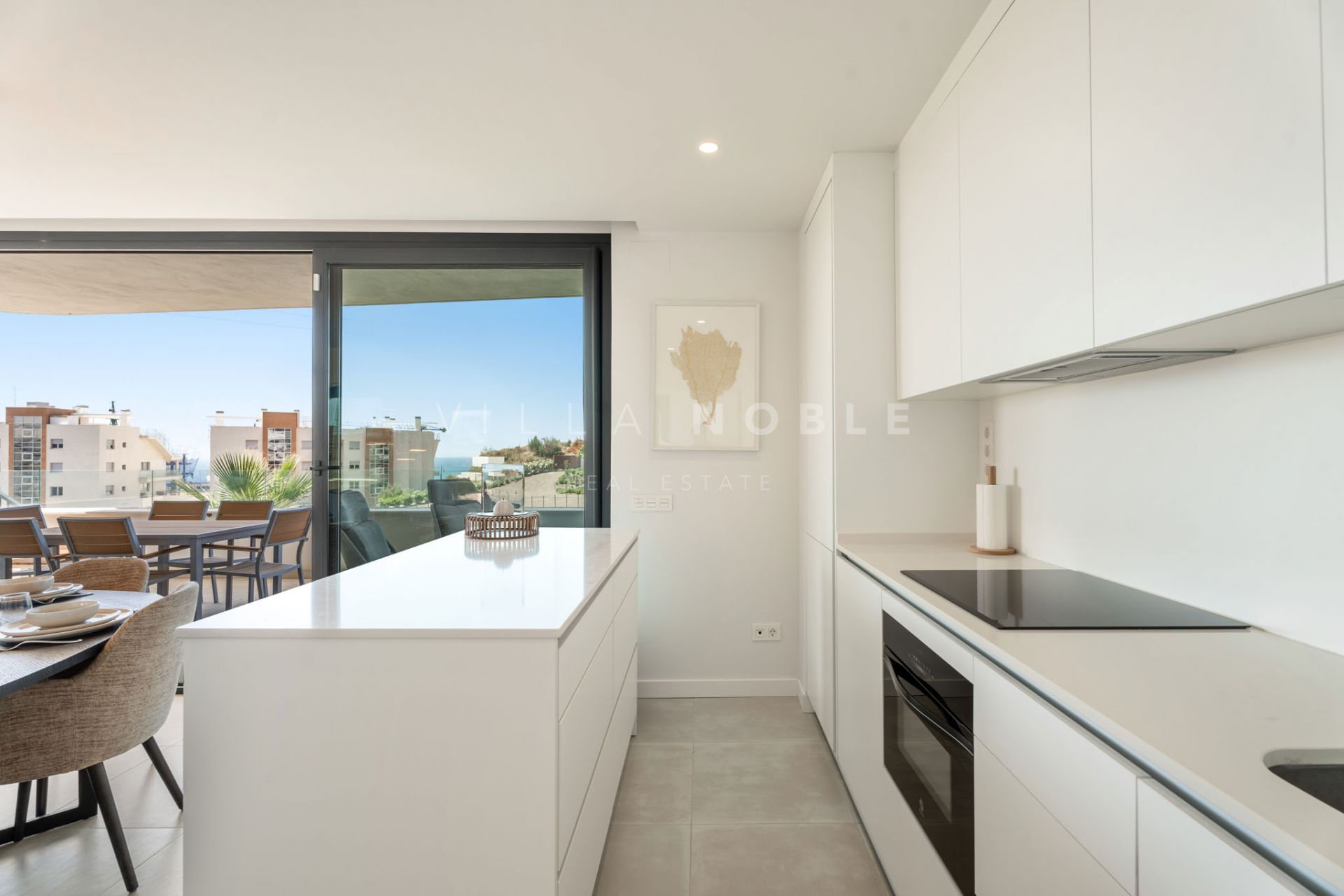 La distribución diáfana conecta la cocina totalmente equipada, el comedor y el salón. Grandes puertas correderas dan acceso a espacios exteriores privados y ofrecen vistas parciales al Mediterráneo. La cocina incluye electrodomésticos integrados y armarios modernos. Los acabados de toda la vivienda reflejan un diseño moderno con materiales duraderos y neutros.