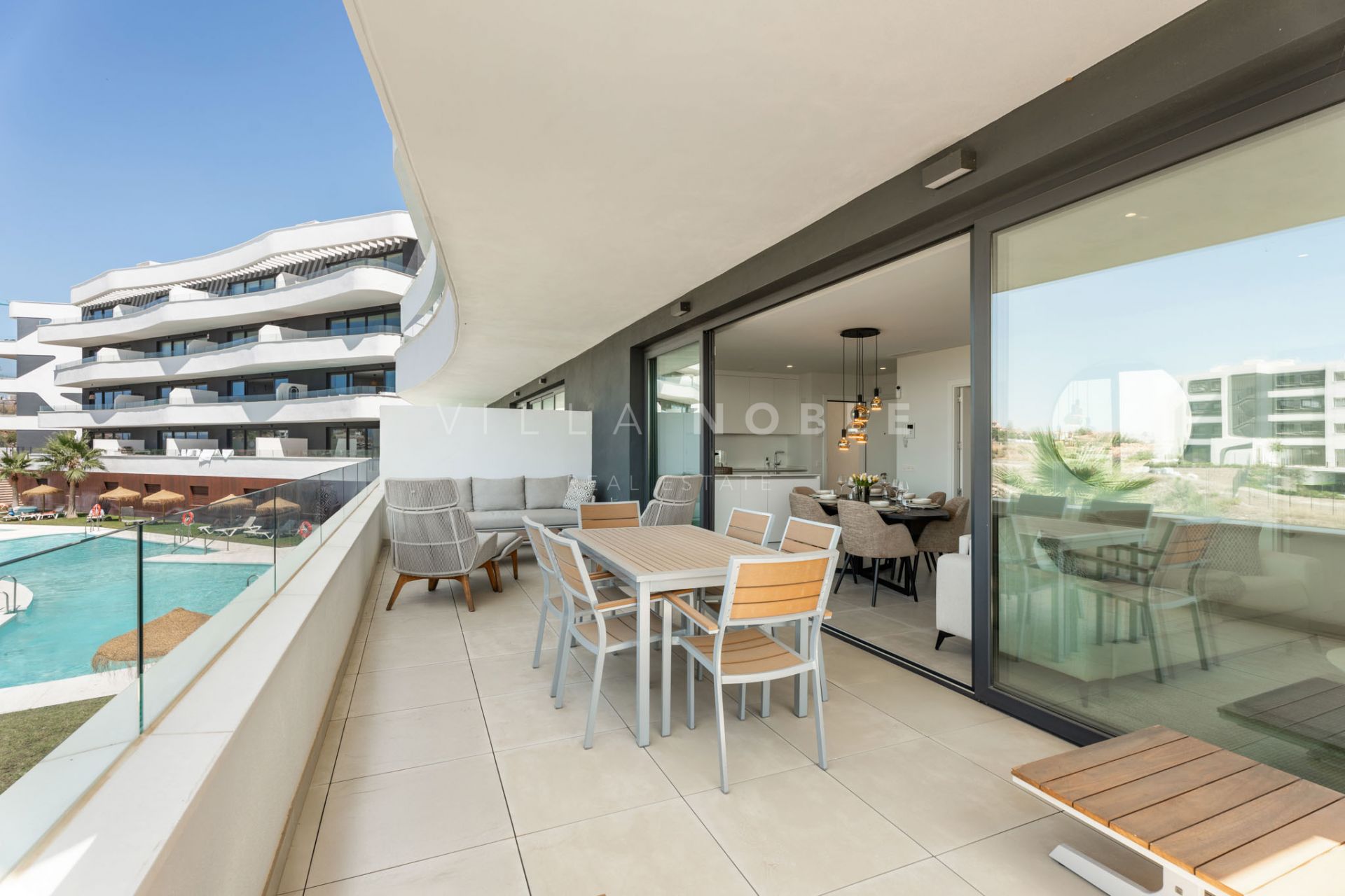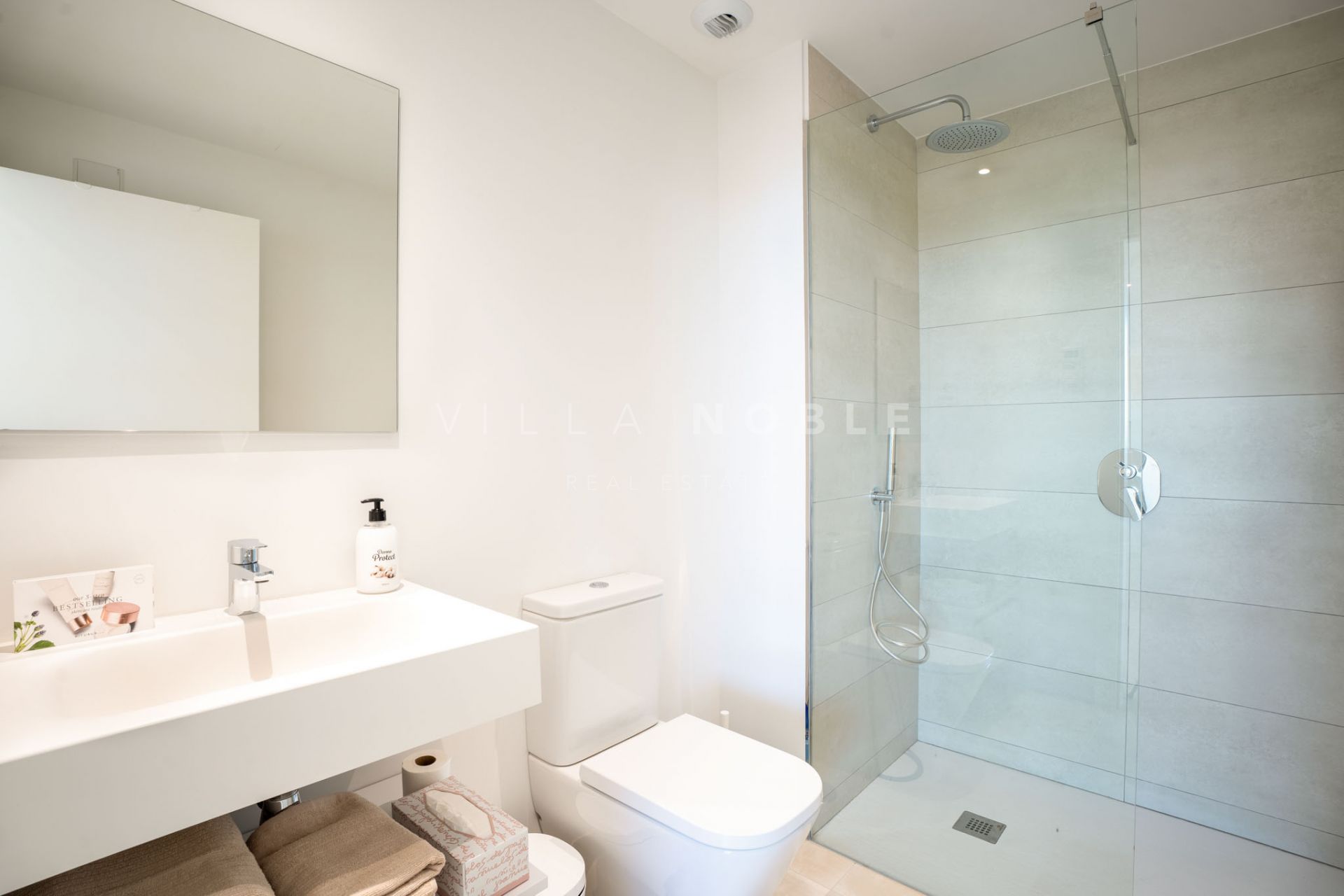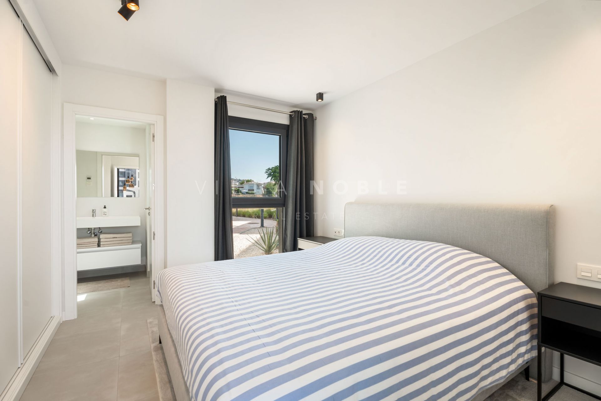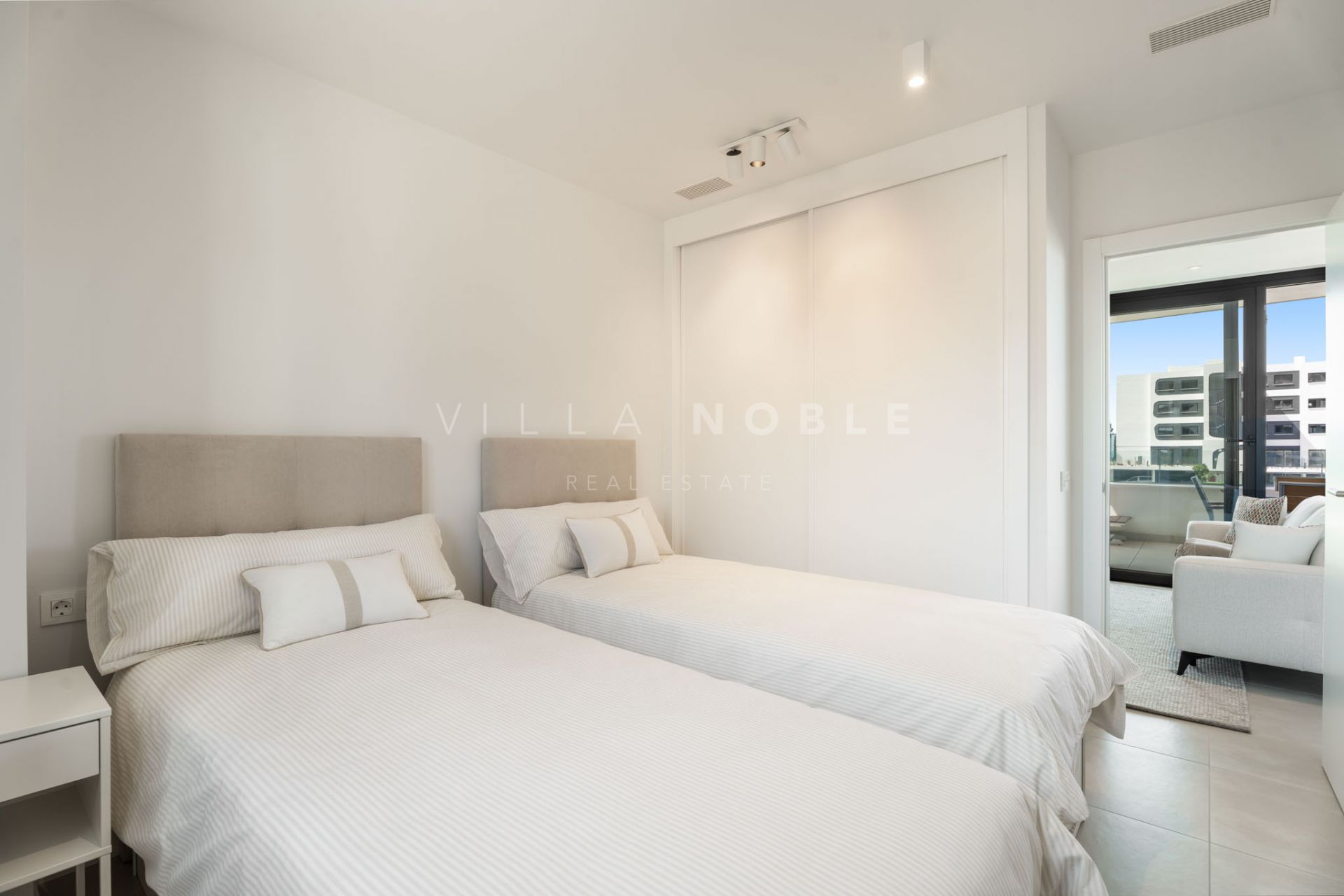 La distribución diáfana conecta la cocina totalmente equipada, el comedor y el salón. Grandes puertas correderas dan acceso a espacios exteriores privados y ofrecen vistas parciales al Mediterráneo. La cocina incluye electrodomésticos integrados y armarios modernos. Los acabados de toda la vivienda reflejan un diseño moderno con materiales duraderos y neutros.