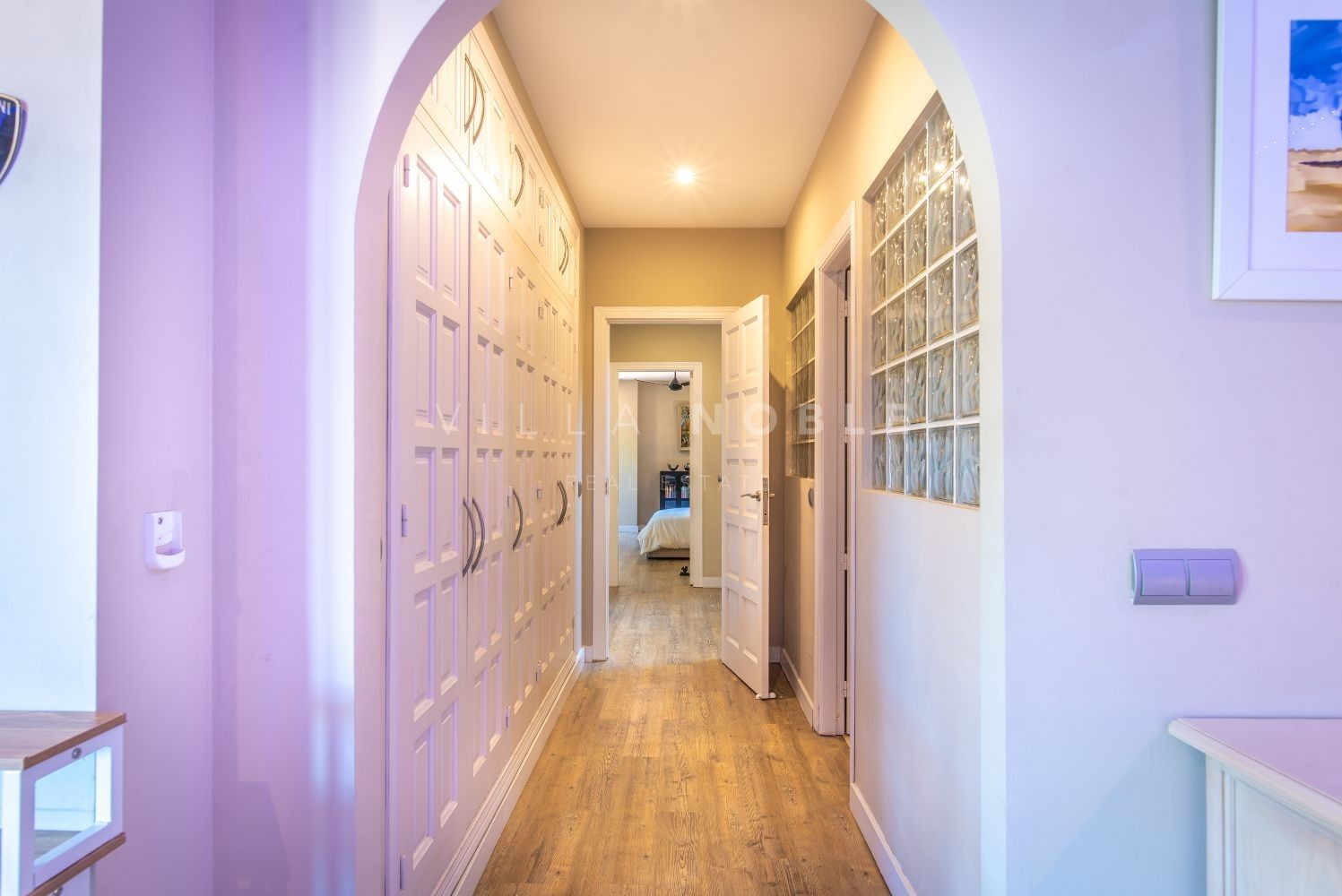 La villa, de estilo andaluz contemporáneo, está orientada al oeste y se distribuye en dos plantas. Cuenta con tres suites dobles con vistas a las copas de los árboles, cada una con elegantes baños de mosaico de pizarra natural, madera y cristal que complementan el entorno natural. La suite principal es excepcionalmente espaciosa, con 40 m², más grande que un típico apartamento de dos habitaciones en el centro de Londres. Todas las habitaciones dan a amplias terrazas, lo que proporciona privacidad y vistas impresionantes.