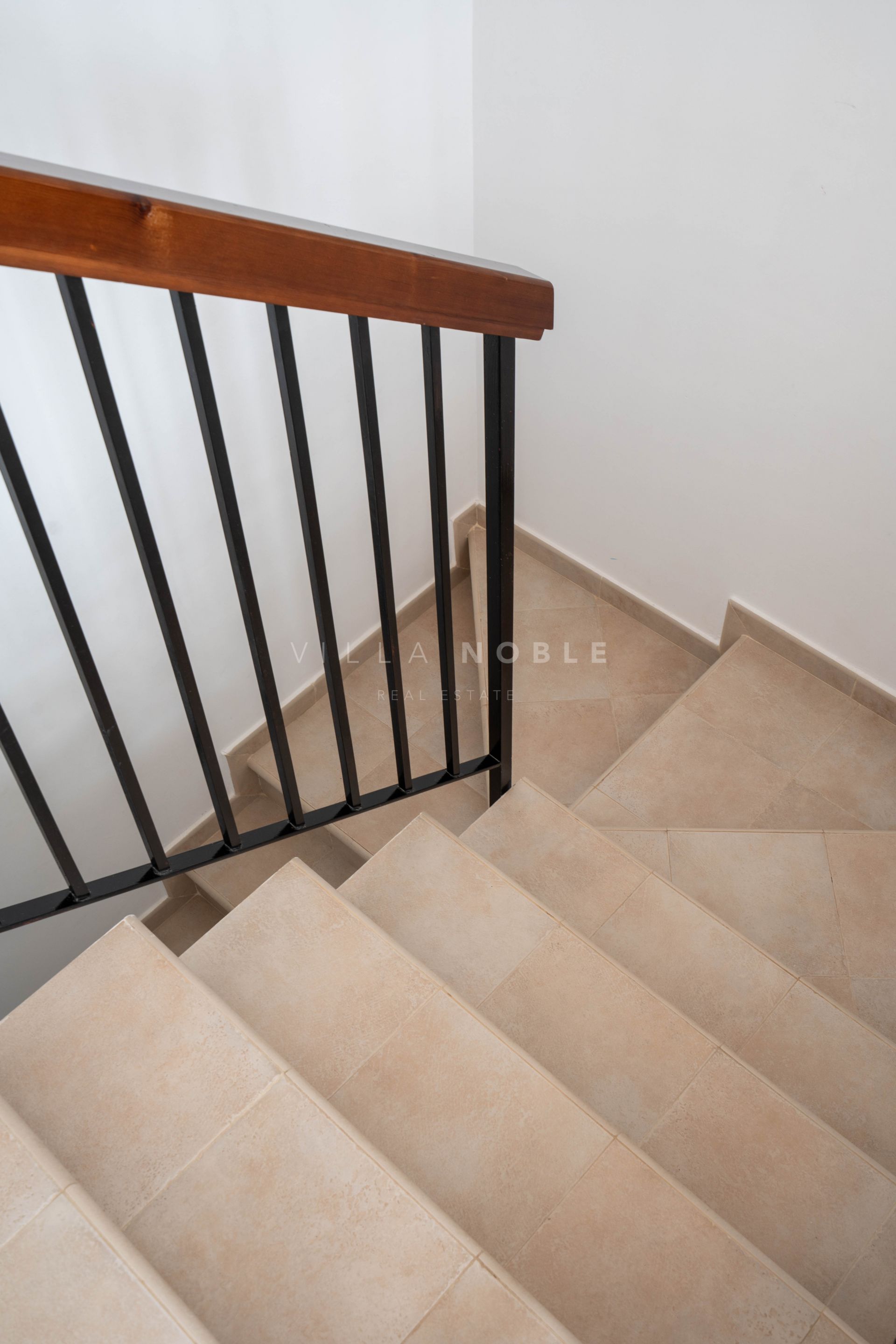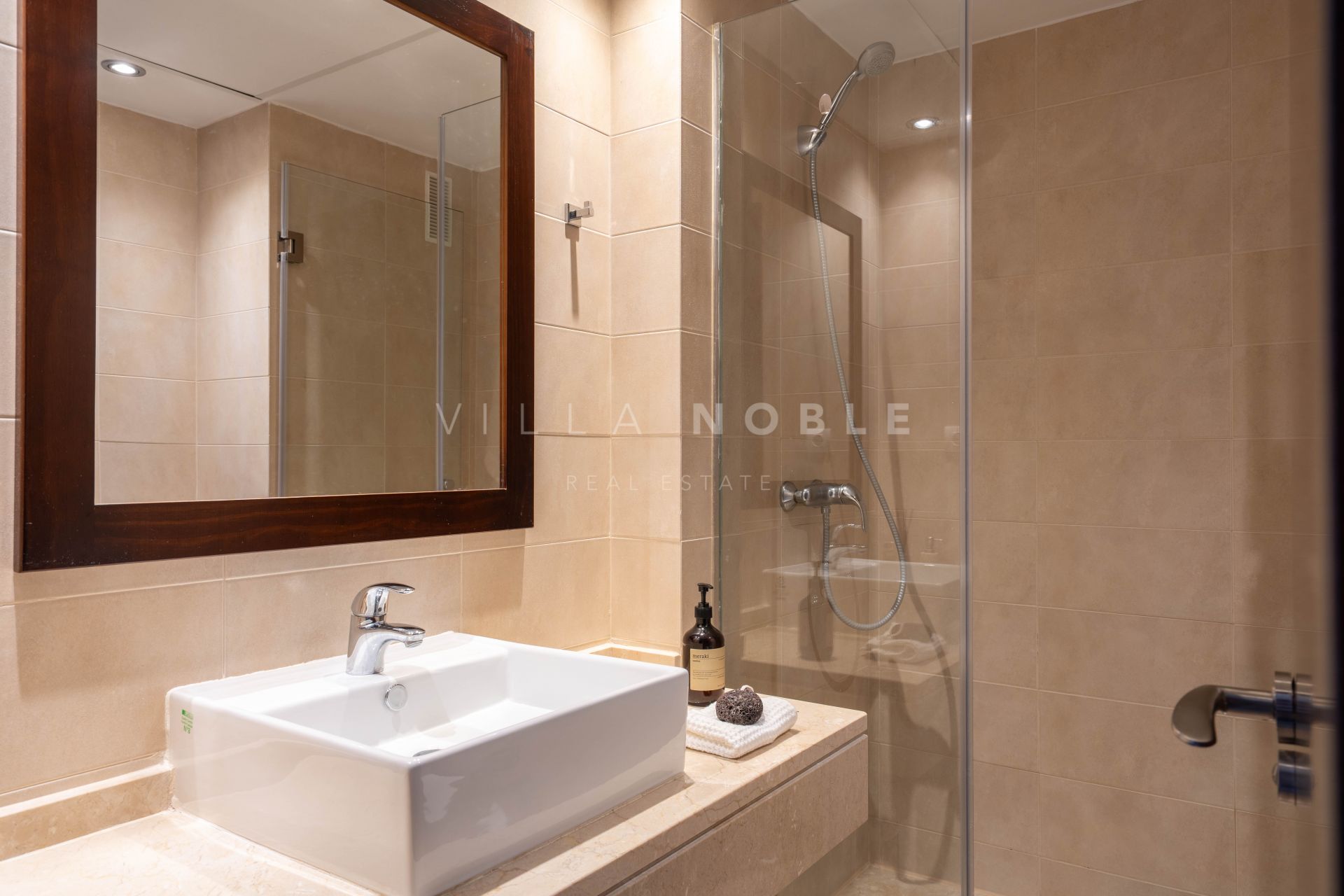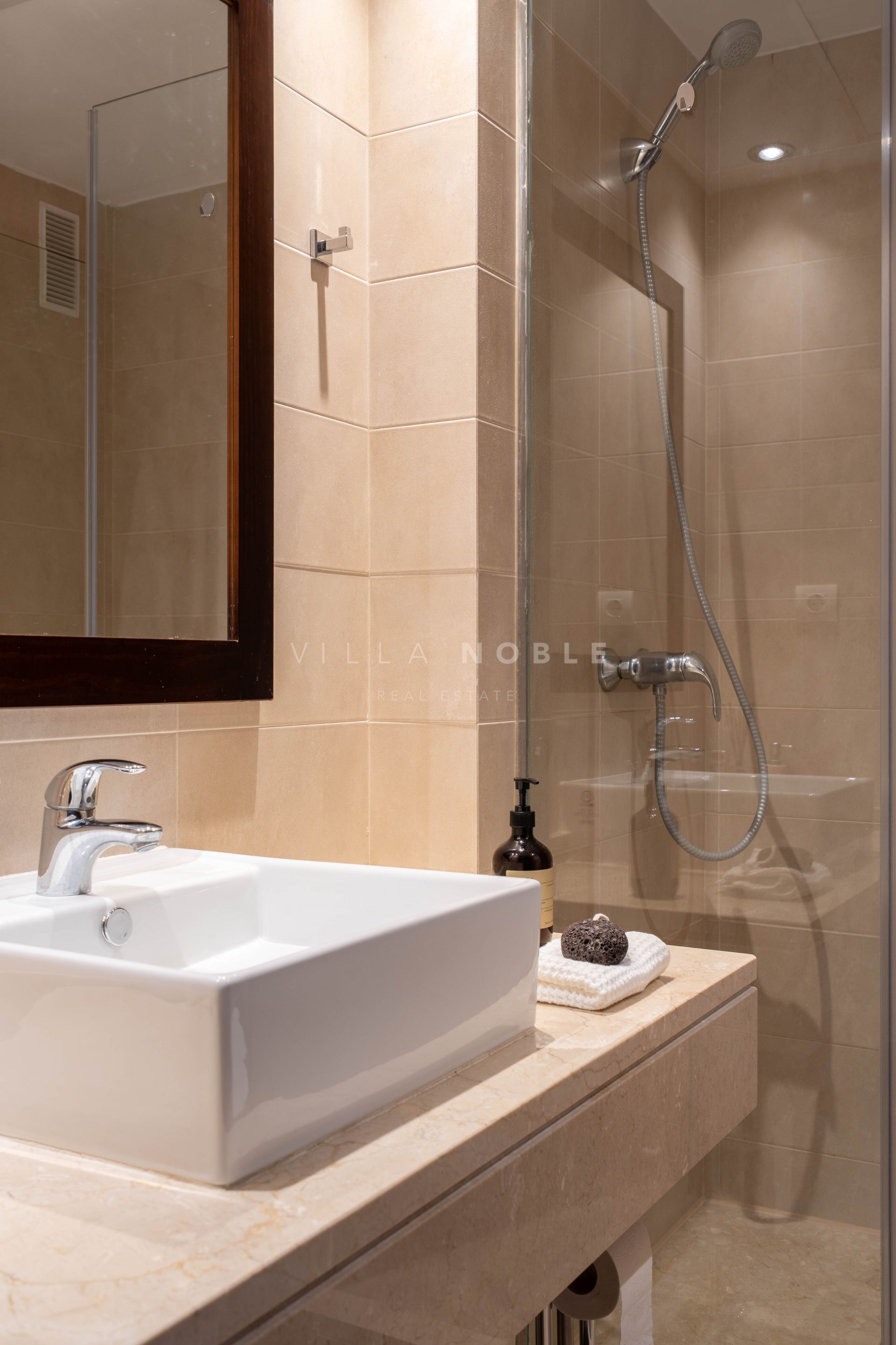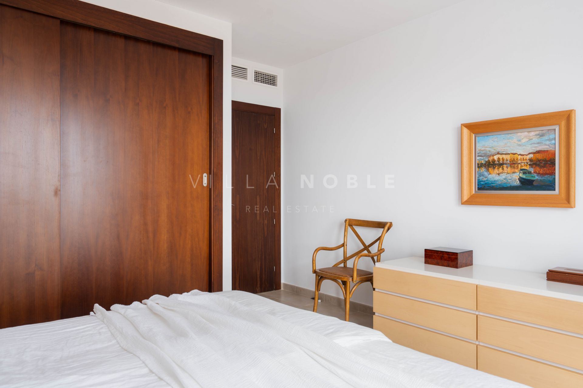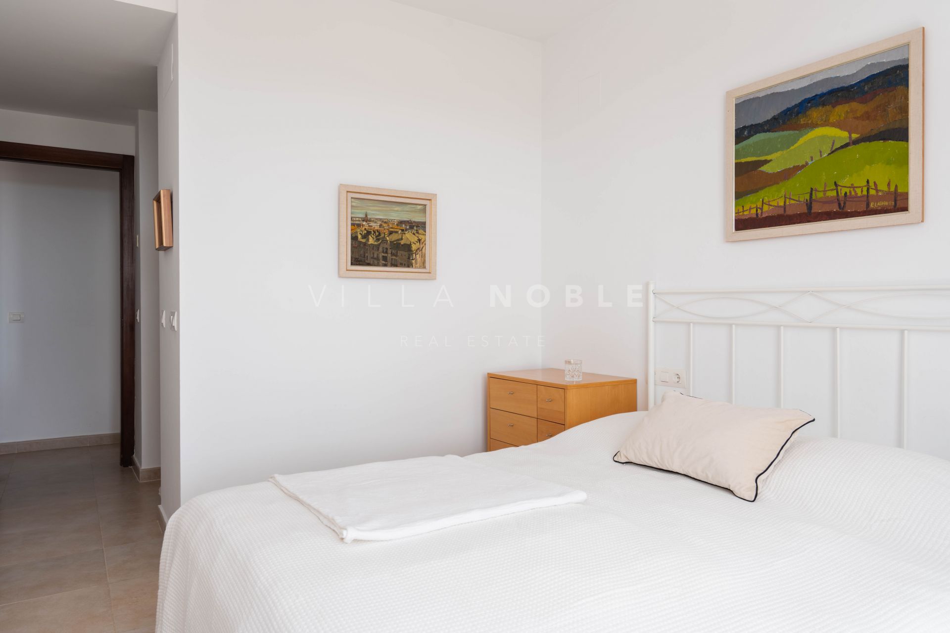 Distribuido en dos plantas, el ático cuenta con dos amplios dormitorios y dos baños, además de un práctico aseo de invitados en la planta principal. Un dormitorio se encuentra en la primera planta con acceso directo a la terraza principal, mientras que el dormitorio principal se encuentra en la planta superior y se abre a una terraza privada con vistas elevadas al mar, perfecta para disfrutar de su café de la mañana o del atardecer en total tranquilidad.